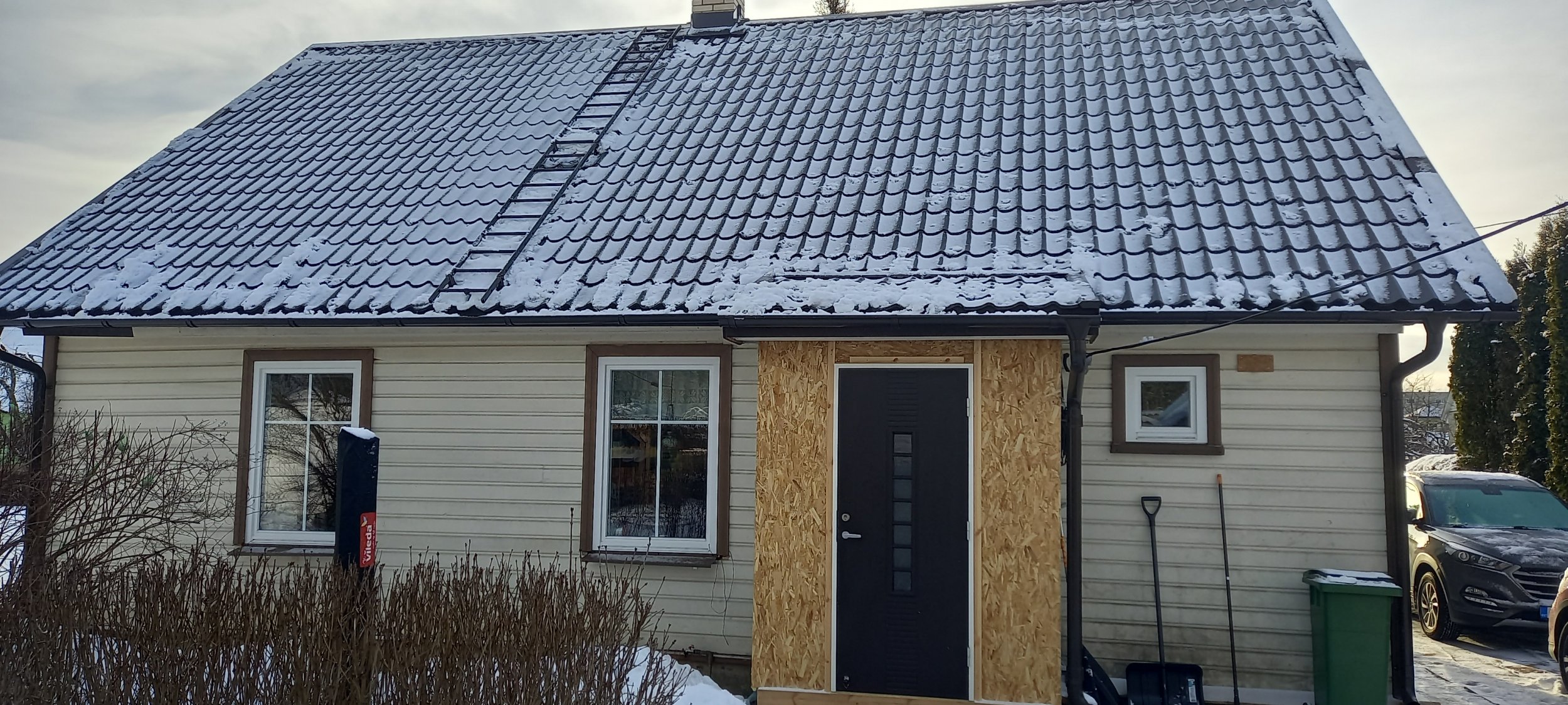 Palkmaja soojustamine ja uue voodrilaua paigaldamine. Vundamendi soojustamine. Tuulekoja ehitamine.