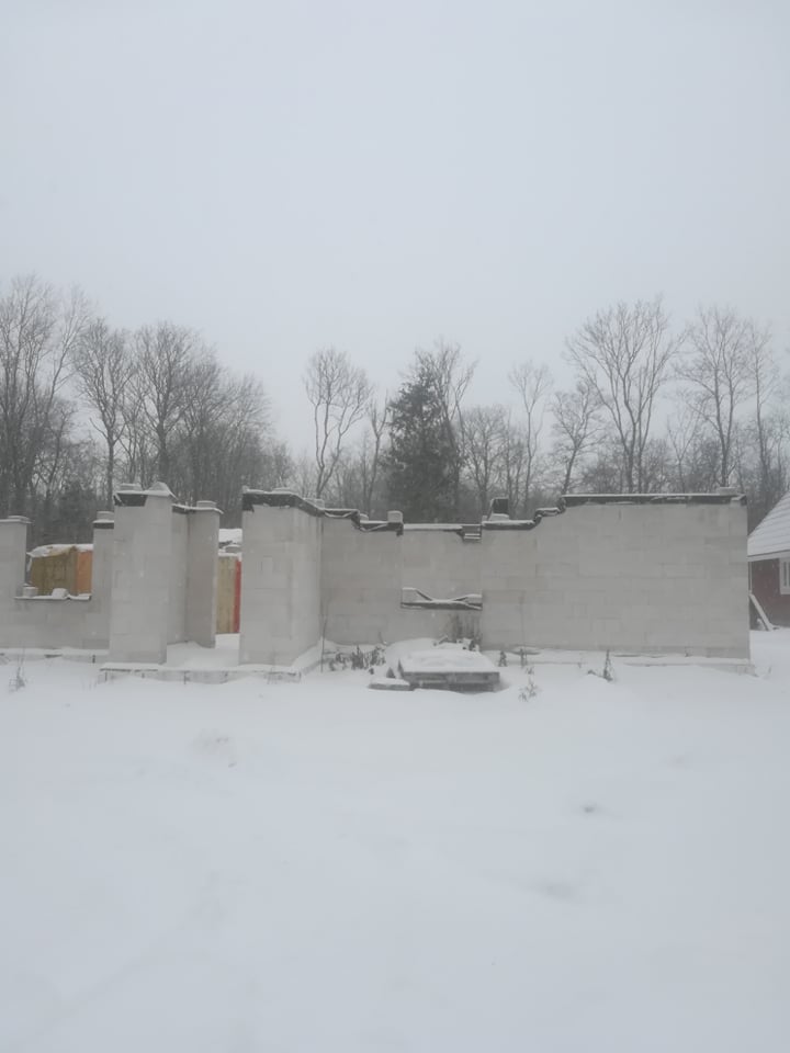 Poolelioleva elamu seinte ladumine bauroc seinaplokkidest, vahelagede paigaldus ja viilkatuse ehitus koos soojustuse paigaldusega.