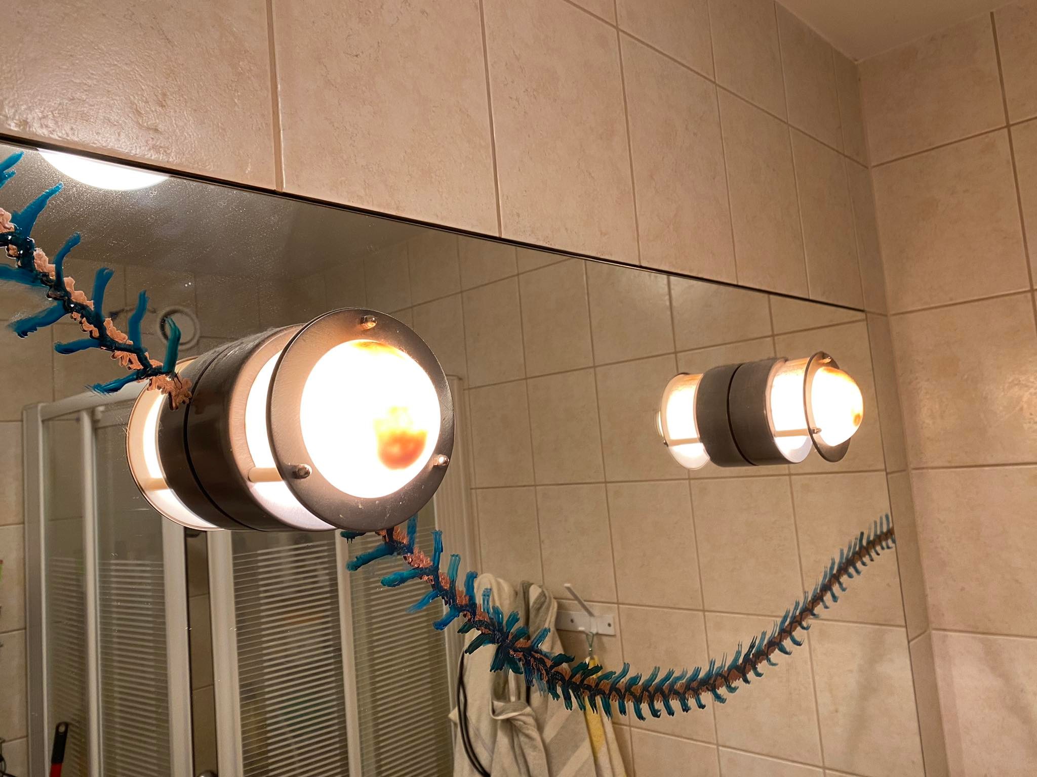Plaaditud seinast eemaldada mõraga peegel (100x140 cm)+valgustid. Asemele paigaldada valgustiga peegelkapp. Vabanenud seinaosa plaatida. Peegelkapp ja plaadid olemas.