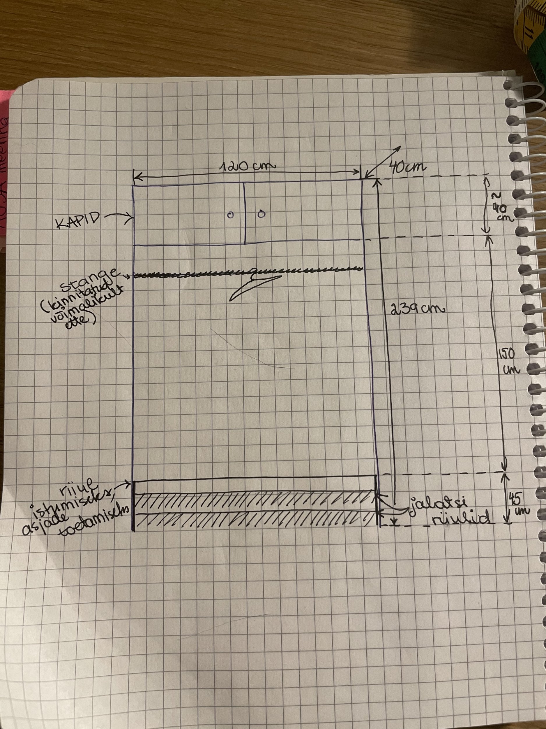 Soovin koju esikusse avatud kappi. Loodan, et joonistatud pilt annab edasi minu soovi. Alumine osa, jalatsite riiul ja istumisalus peaks ülejäänud kapist eraldi jääma nii, et seda saaks vajadusel eemale tõsta. Materjal võiks olla valget värvi melamiiniga kaetud MDF plaat.