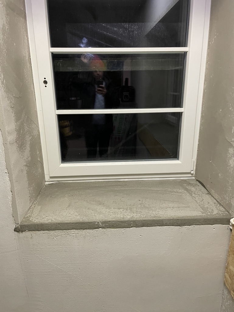 Plaadid on mõõdus 120x60cm, aluspind on valatud. Plaadid vaja lõigata mõõtu ja välisserv 45 kraadi alla. Aknalaudu kokku 17, osad tuleb lahendada kahe plaadiga. Vuukimine epovuugiga (vuugisegu tuleb tellija poolt), aga kokku ainult 9 vuuki, mis on ca 45cm pikad. Ilmselt on mõistlik plaat teipida vuukimiseks.