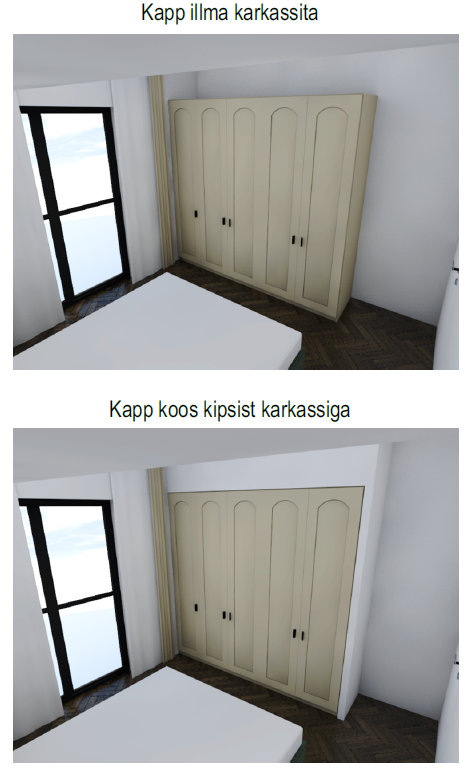 Lae kõrgus: ca 3000. Ehitada kapi kohale kipsist karkass, lisaks kipssein (ühele VÕI kui mahub, siis mõlemale poole). Viimistleda, värvida sama värvi, mis ülejäänud seinad (Vivacolor Wall 4 valge värv/NCS S 0500-N).