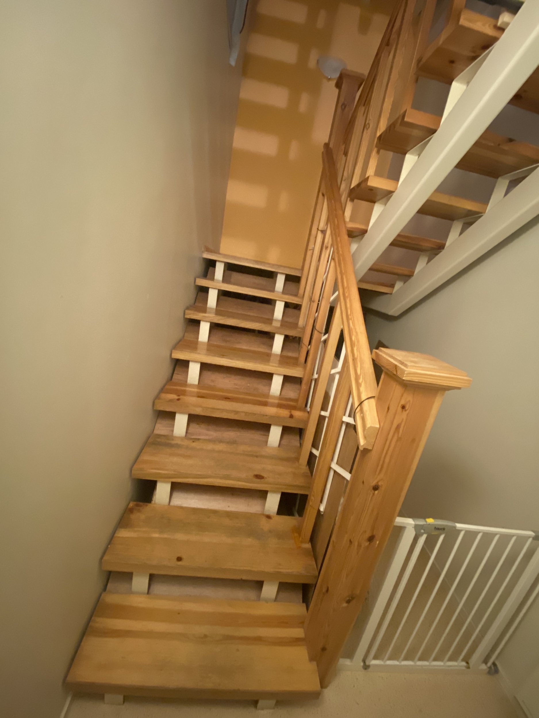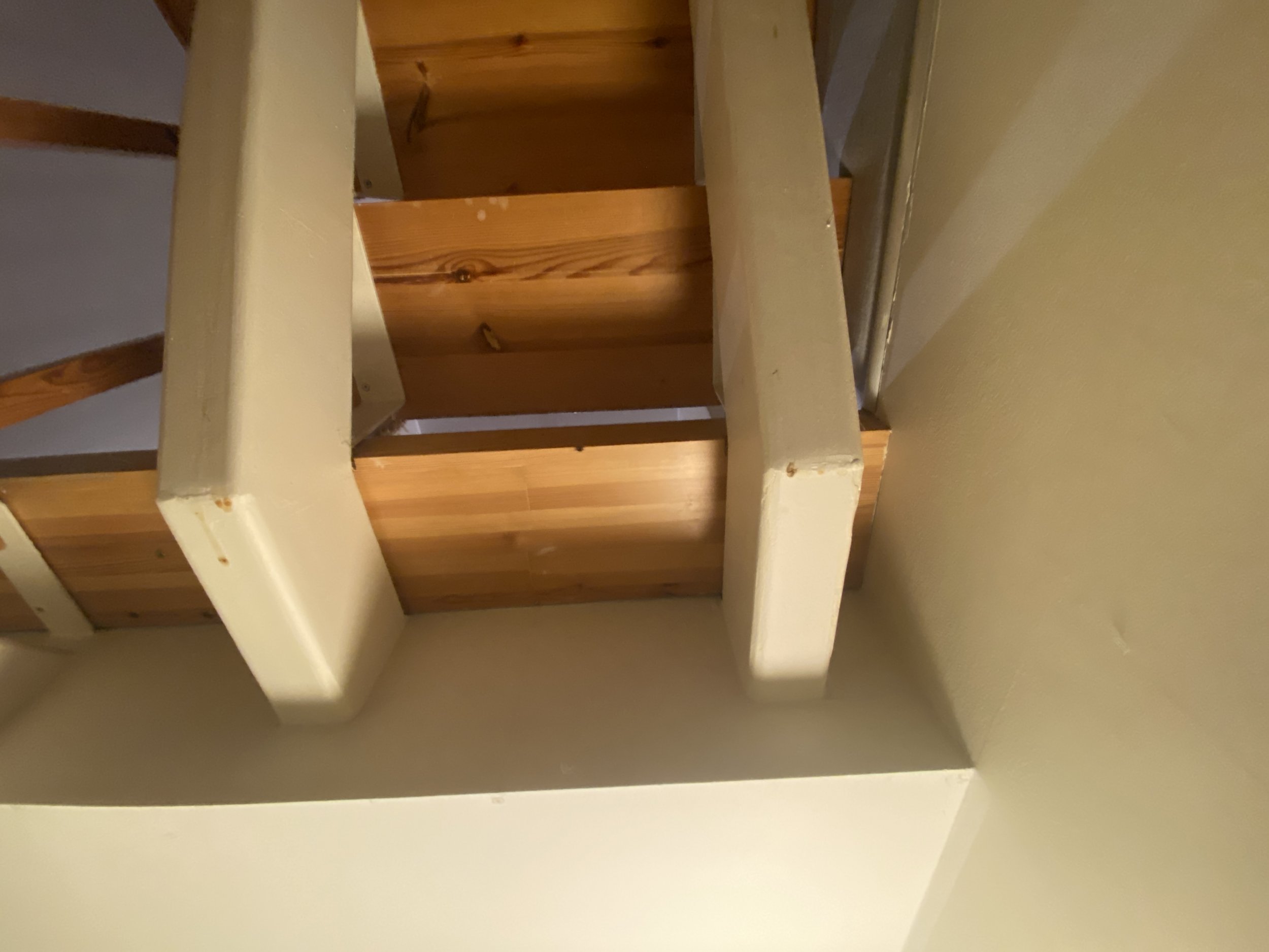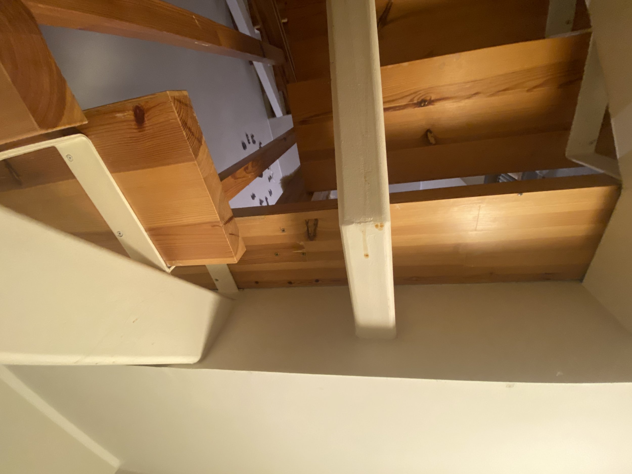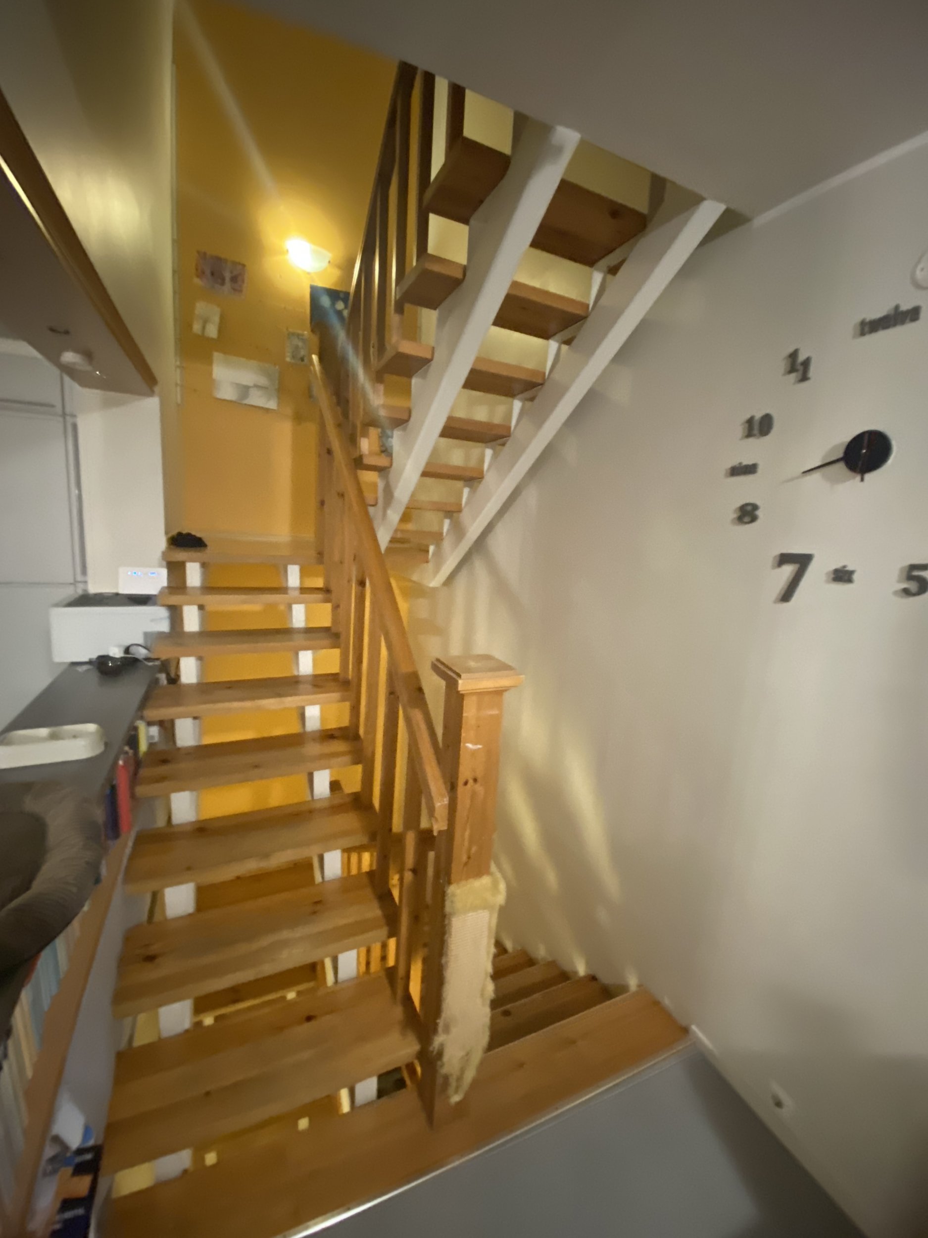 Ridaelamu, sisetrepp puidust, metallkarkassil, puidust käsipuuga. Kolm korrust. 30 astet. 2 platvormi. Vana lakk maha (astmed, käsipuud), puhastada, mõned astmed korrastada. Astmed kruvidega karkassi küljes, samuti käsipuu. Puhastatud pind tulitöödelda ja katta lakiga. Tagasipaigaldamisel veenduda, et astmed, käsipuu ei jääks kiuksuma. Trepi karkass puhastada, tasandada ja värvida. Puitosad viia puhastamiseks töö teostaja juurde, tagades samal ajal perele normaalne trepist liikumine (paigaldatud mingid vastupidavad trepi astmelauad, platvormid. Käsipuu asendamine pole kohustuslik)