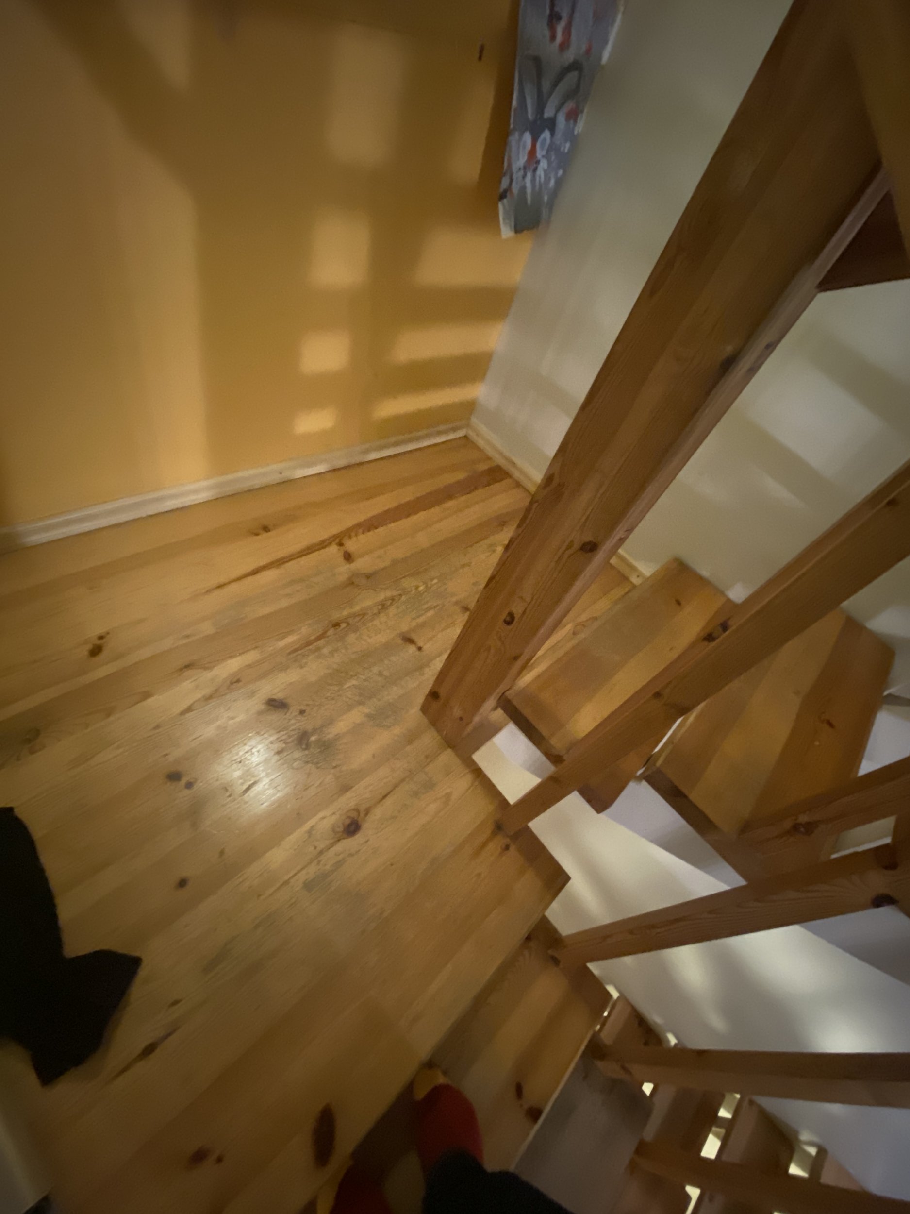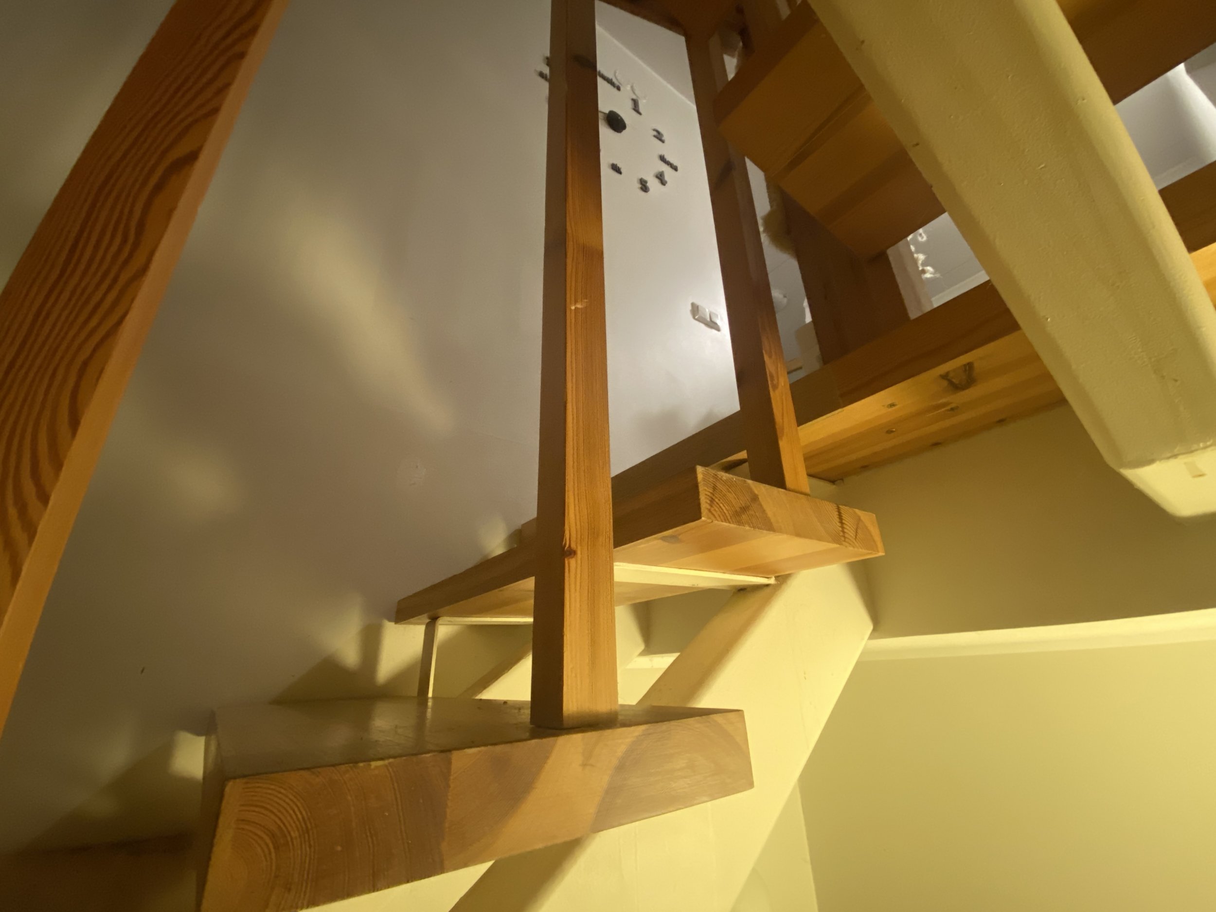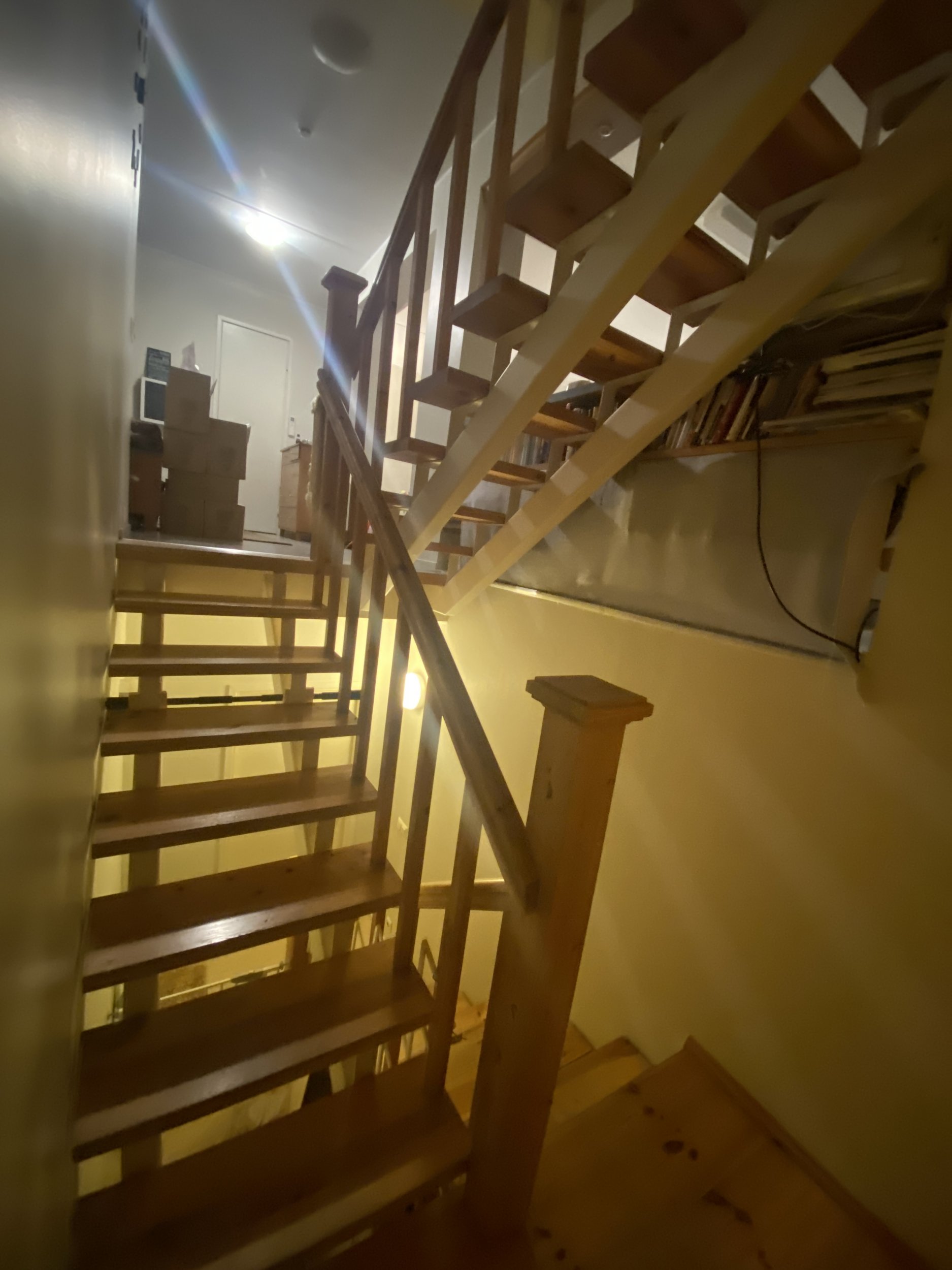 Ridaelamu, sisetrepp puidust, metallkarkassil, puidust käsipuuga. Kolm korrust. 30 astet. 2 platvormi. Vana lakk maha (astmed, käsipuud), puhastada, mõned astmed korrastada. Astmed kruvidega karkassi küljes, samuti käsipuu. Puhastatud pind tulitöödelda ja katta lakiga. Tagasipaigaldamisel veenduda, et astmed, käsipuu ei jääks kiuksuma. Trepi karkass puhastada, tasandada ja värvida. Puitosad viia puhastamiseks töö teostaja juurde, tagades samal ajal perele normaalne trepist liikumine (paigaldatud mingid vastupidavad trepi astmelauad, platvormid. Käsipuu asendamine pole kohustuslik)