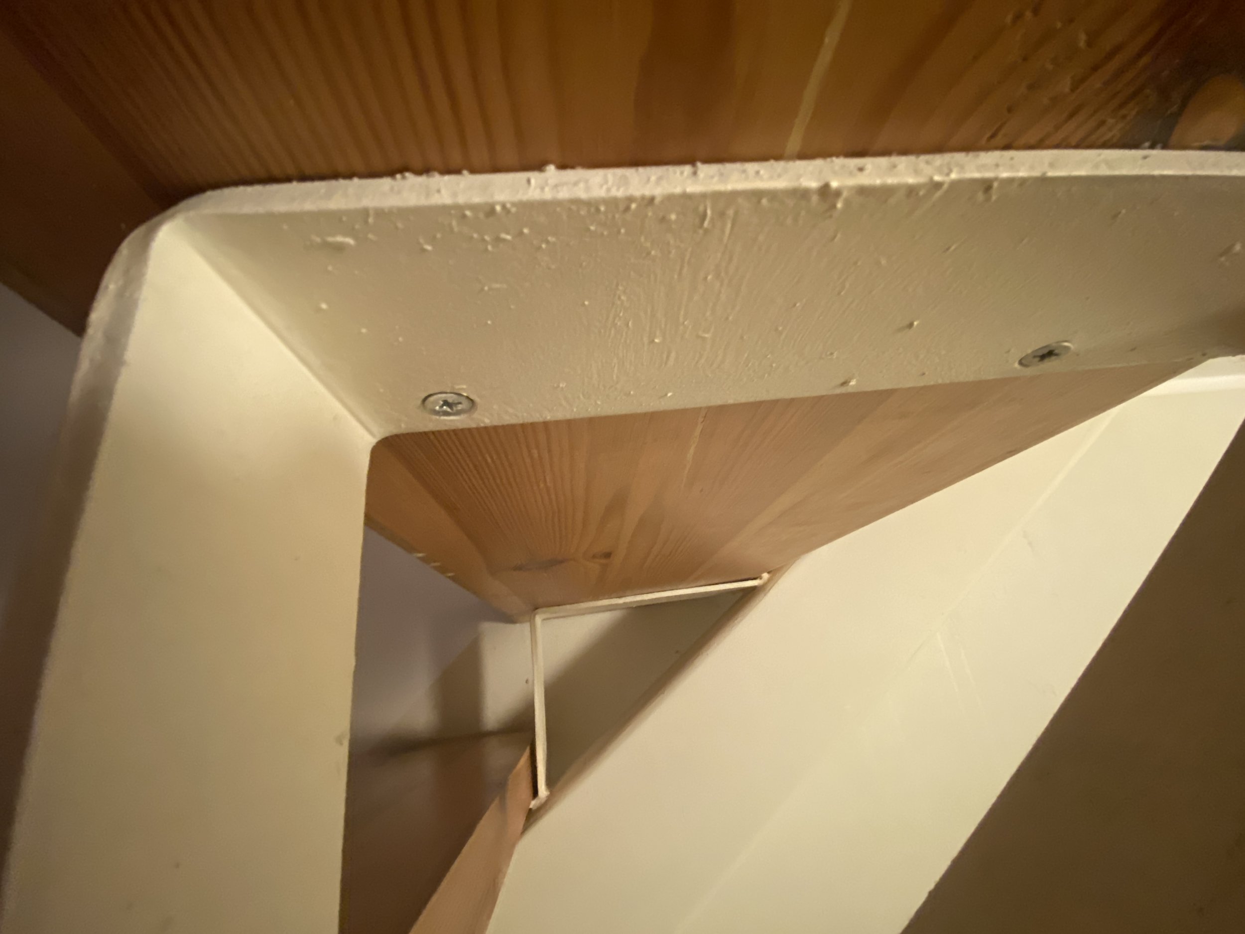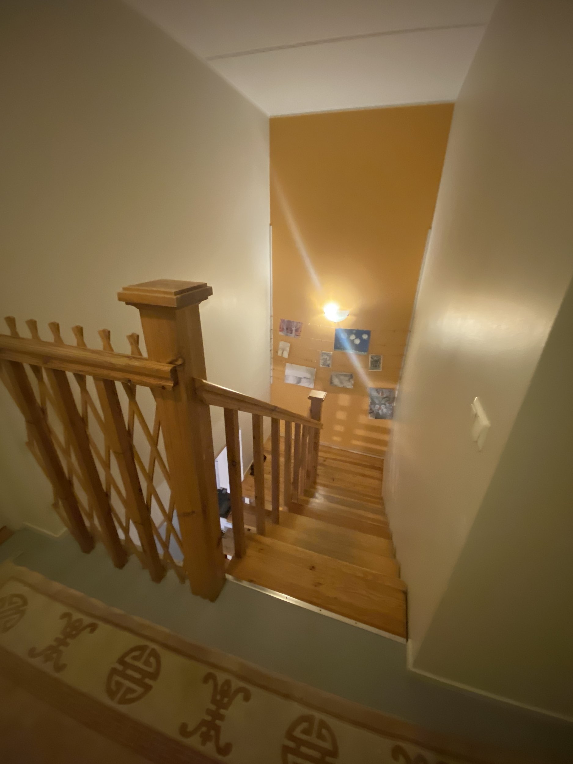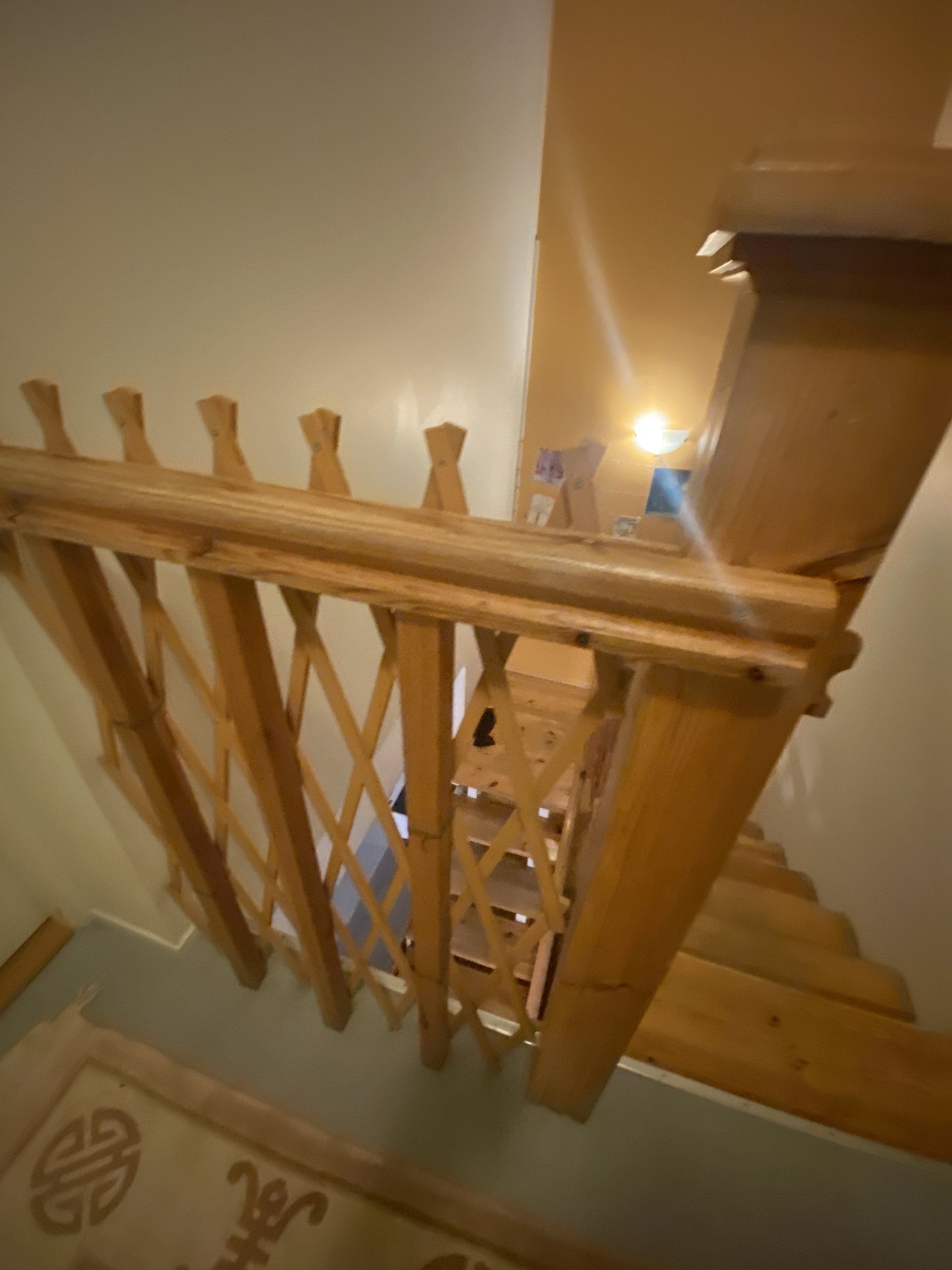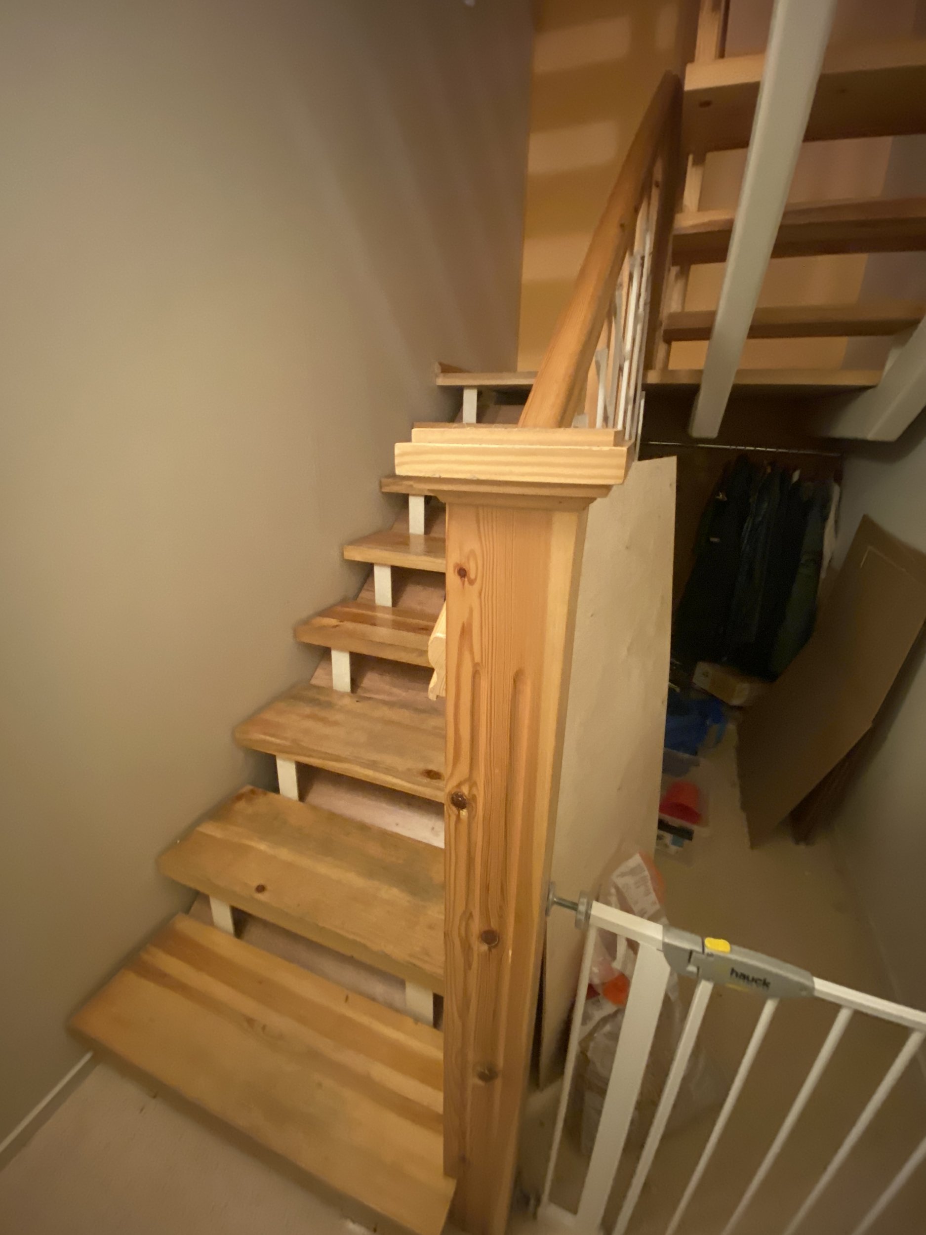 Ridaelamu, sisetrepp puidust, metallkarkassil, puidust käsipuuga. Kolm korrust. 30 astet. 2 platvormi. Vana lakk maha (astmed, käsipuud), puhastada, mõned astmed korrastada. Astmed kruvidega karkassi küljes, samuti käsipuu. Puhastatud pind tulitöödelda ja katta lakiga. Tagasipaigaldamisel veenduda, et astmed, käsipuu ei jääks kiuksuma. Trepi karkass puhastada, tasandada ja värvida. Puitosad viia puhastamiseks töö teostaja juurde, tagades samal ajal perele normaalne trepist liikumine (paigaldatud mingid vastupidavad trepi astmelauad, platvormid. Käsipuu asendamine pole kohustuslik)