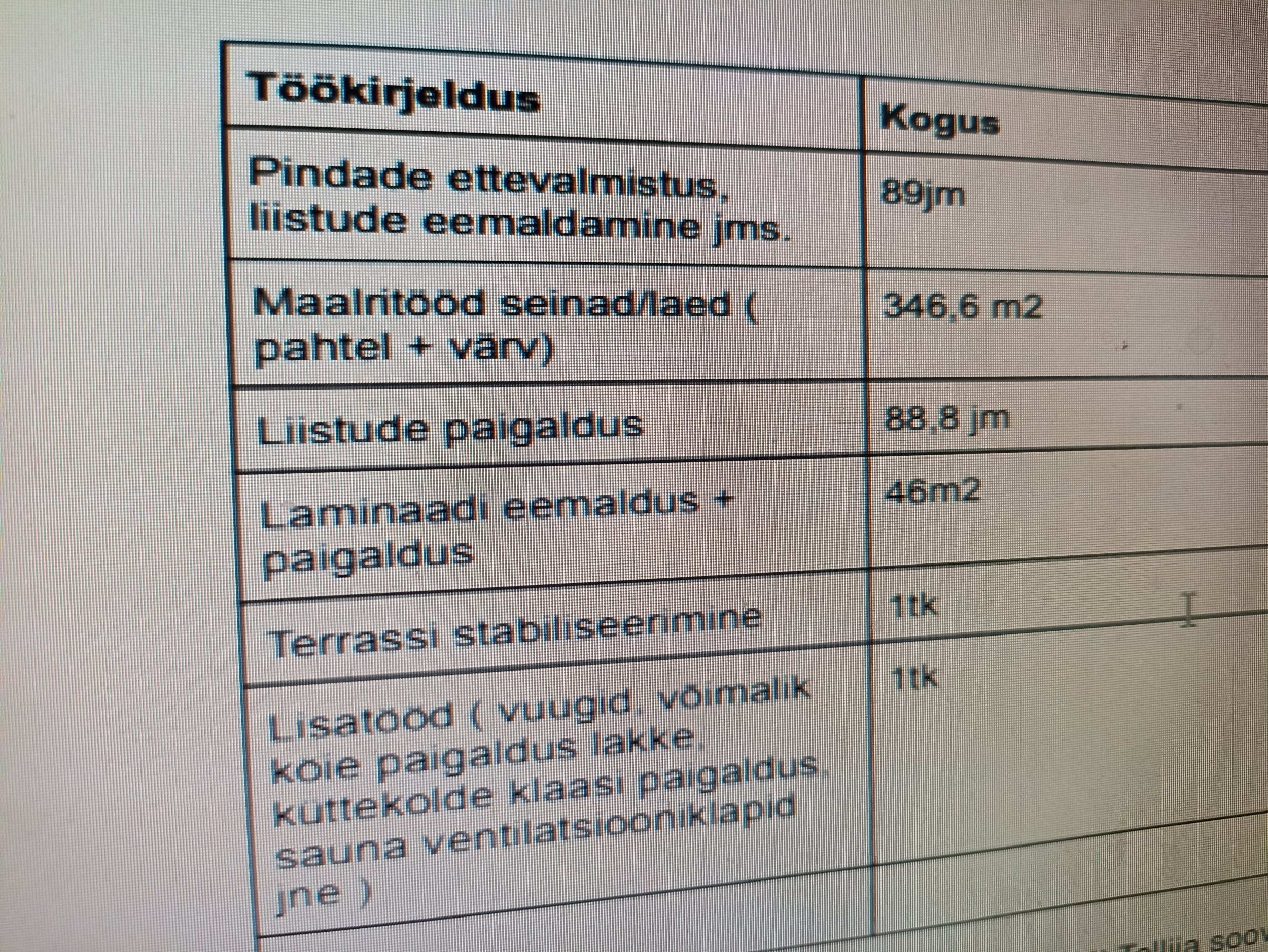 Pakkumise kirjeldus: Tere, pakkumine soovitud töödele,hinna sisse ei ole arvestatud terrassi stabiliseerimist ega lisatöid(akrüülimine hinnas), kuna ei ole täpselt teada nende tööde maht, antud tööd võib arveldada tunnihinnaga 20€ tund. |