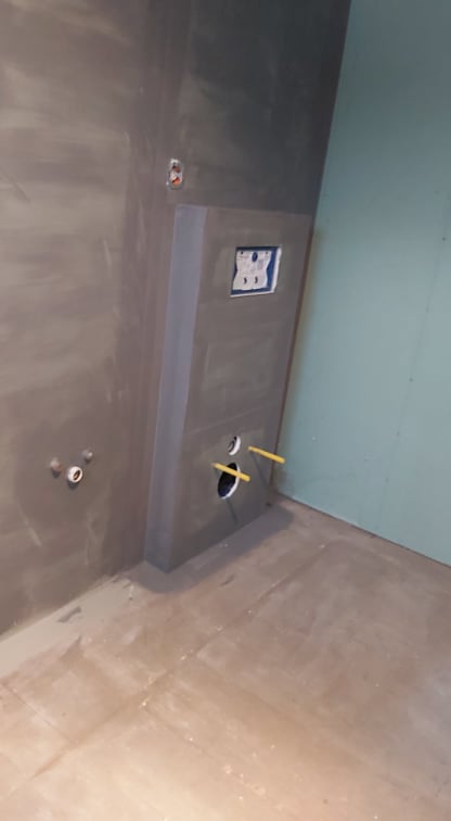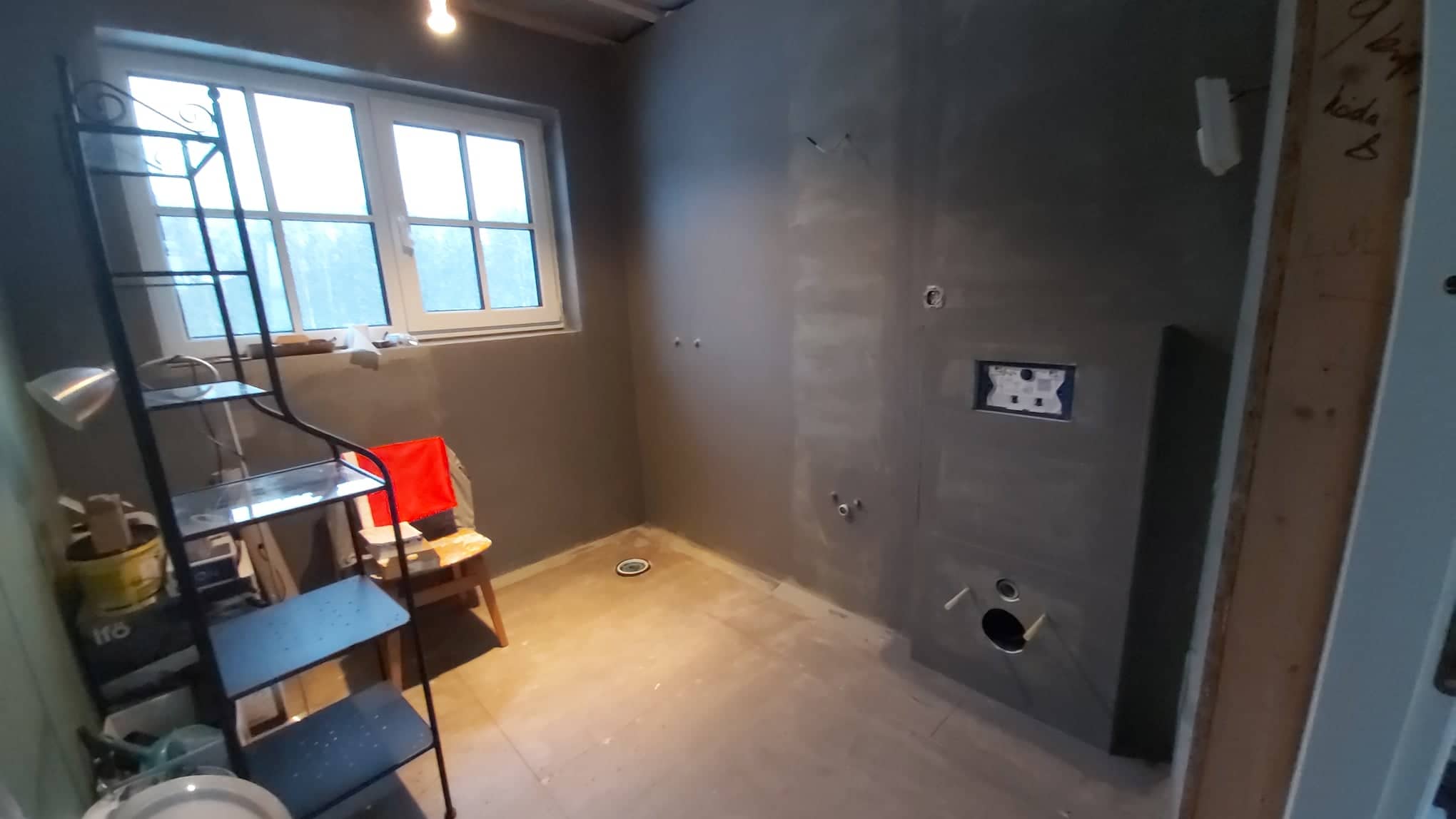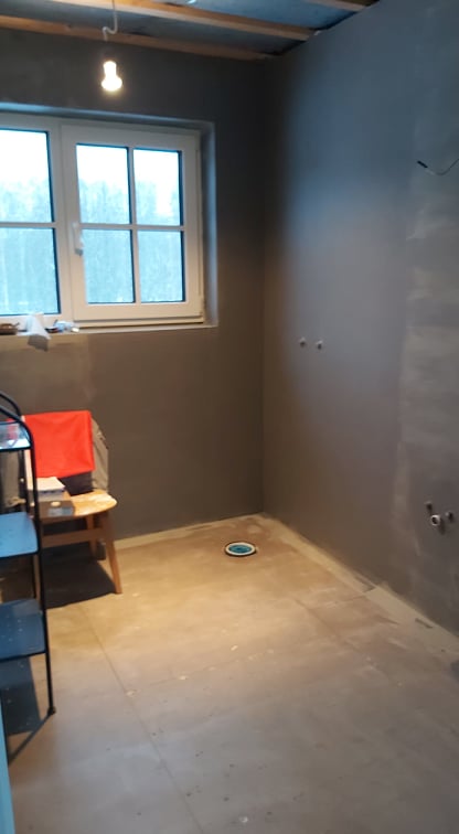 Vannitoa plaatimine, üks sein aknaga, teine seinapoolse wc potiga. Põrnda plaatimine täielikult, üks trapp. Seintele hüdroisolatsioon paigaldatud. Uus maja