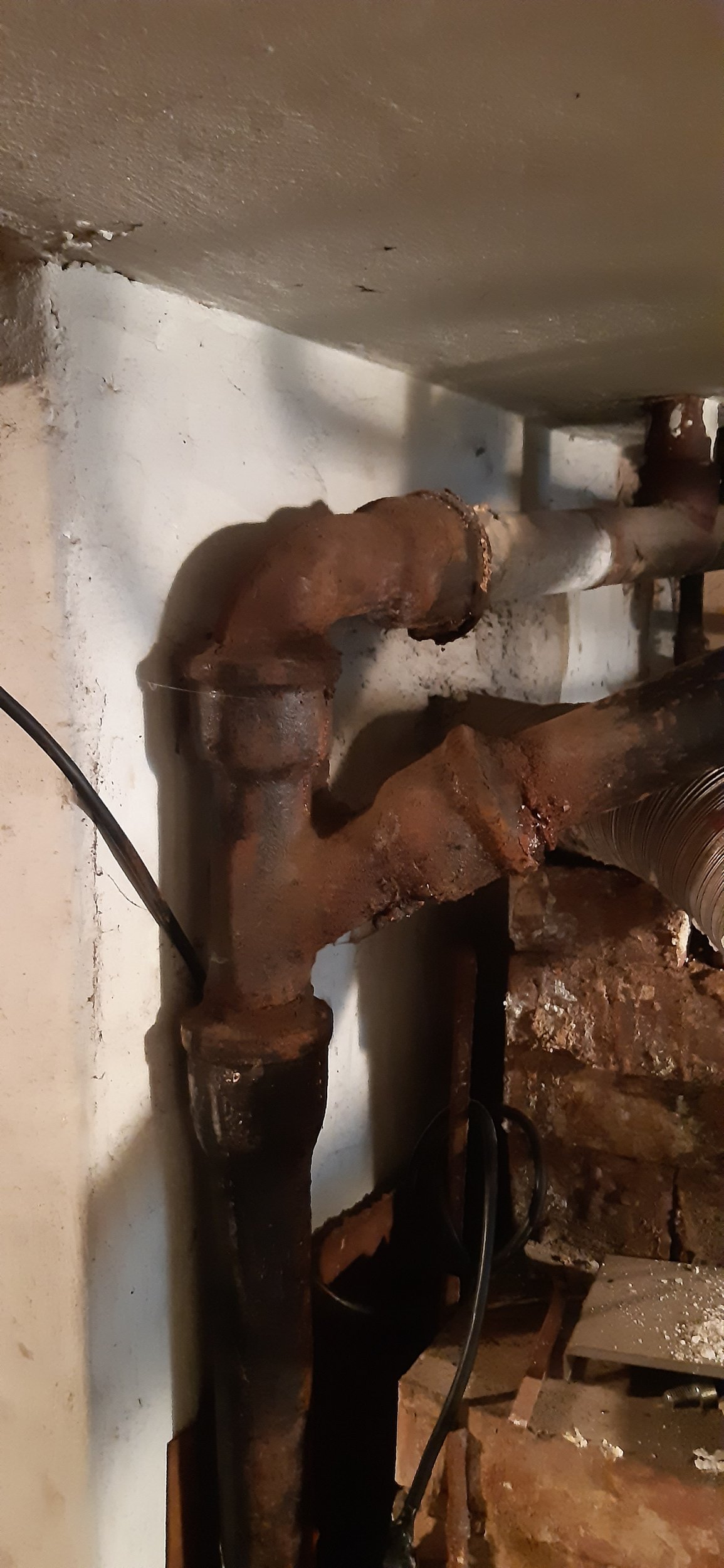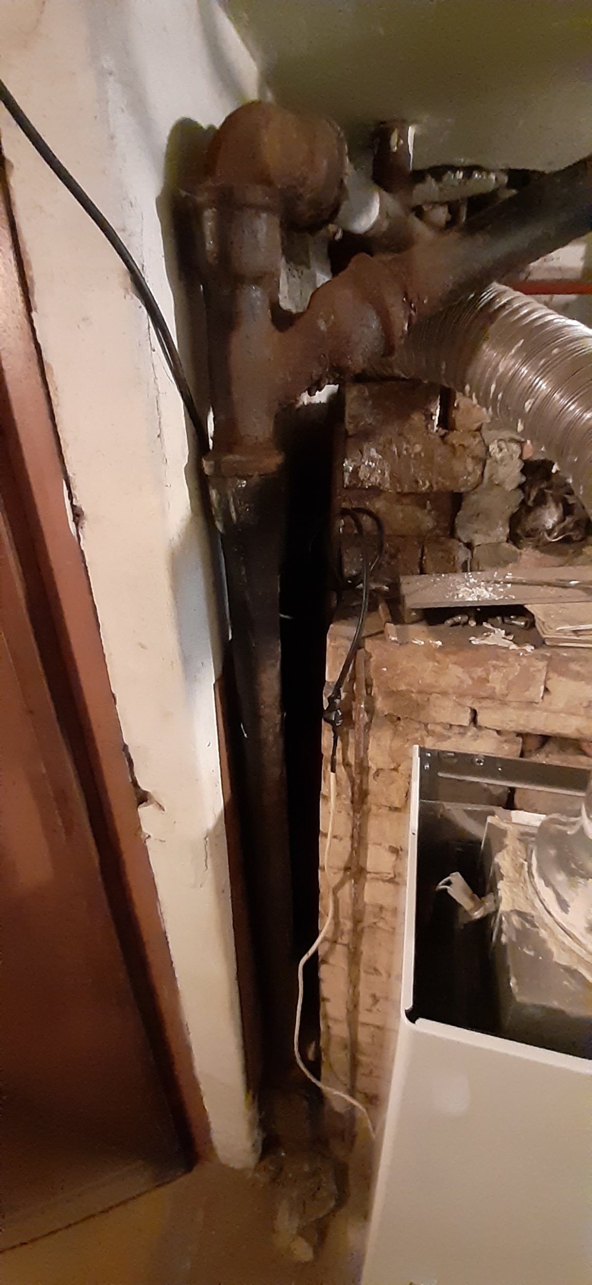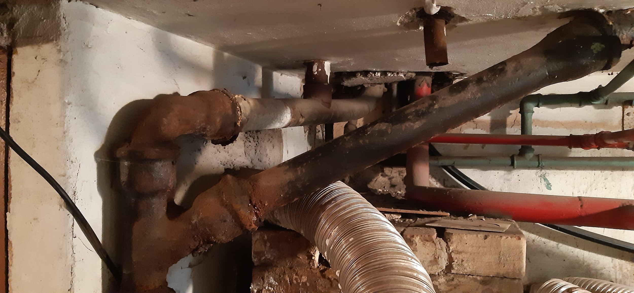 Eramu kanalisatsioonitorude vahetus (vertikaalne katlaruumis + horisontaalne põranda sees).