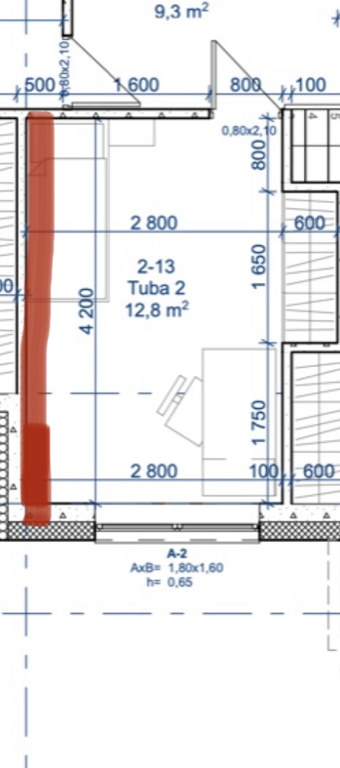 Ühe seina pikkus veidi alla 3m ja teise seina pikkus veidi üle 4m. Kõrgus 2.6m.