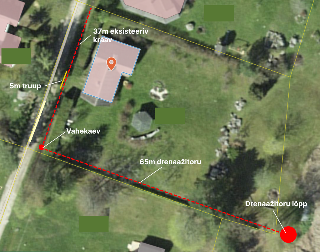 Lisaks rajada veel 65m drenaažitoru (samuti geotekstiilis), mis ühendada ülaltood 37m toruga, ühenduskohta tekitada vahekaev. 65m kohta langust ca 1-1.5m (peaks 2% välja andma), toru lõpetada suurema killupadja sees. 65m peal on ilmselt veel 2-3 õunapuud/kändu, mis jäävad trassile ette, mis tuleks juurida.