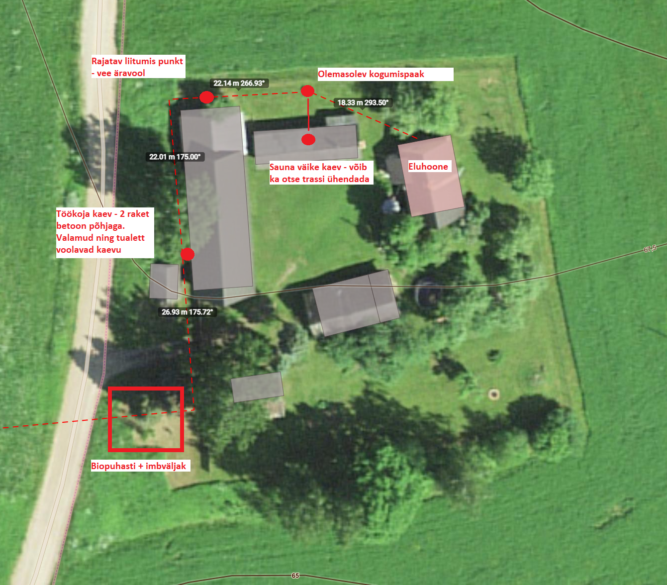 *Arvestame kanalisatsioonitrassi pikkuseks 90jm. Saunamaja juurde paigaldatakse vahele hoolduskaev Dn200, pakkumises 1tk arvestatud. Paigaldatakse 3 hargnemiskaevu Dn400 liitumispunktidesse. *Majast väljuva trassi sobilik sügavus 40cm maapinnast (hetkel tundub, et looduslik kallak on piisav selle pika trassi jaoks. *Peate arvestama sellega, et imbväljak peab jääma vähemalt puurkaevust 60m ja salvkaevust 50jm kaugusele (moreen pinnase puhul). Biopuhasti ise võib lähemale jääda. Hinnas teostusjärgne geodeesija ja projekt. Ehitis ja kasutusteatise esitame ka ära! *Liiv, killustik ja muu materjal kajastub hinnas koos vajamineva tehnikaga. Töödele ja toodetele garantii . Osa tehtud töid näha meie konto alt. Küsimustele avatud! Lugupidamisega Gennadi |