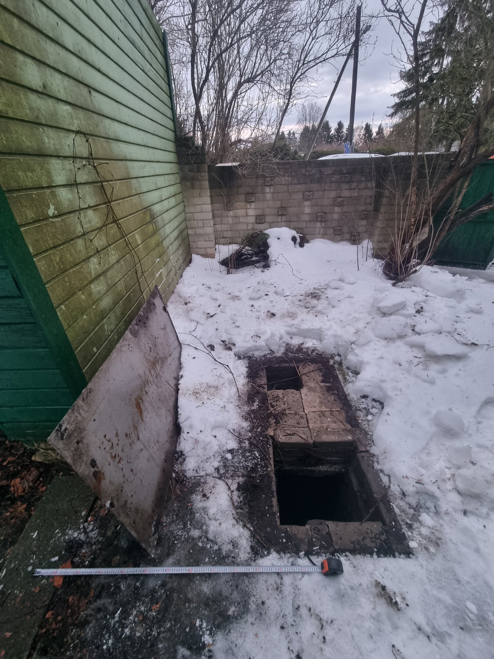 Oluline on ka märkida, et trassi keskele jääb suur hallveekaev, mis on 1.8m sügav ning ca 2m x 2.5m (piki trassi) suur, mis tähendab, et maja vundamendi ja hallveekaevu ning kaevu ja aia vahele jääb vaid napid meetrid kaevamisruumi. Lisaks ei pääse suur ekskavaator sellele asukohale ligi. Seega tundub esmasel vaatlemisel loogiline lahendus käsitsi kaevata lahti vundamendi ja hallveekaevu vaheline lõik ning hallveekaevust liitumispunktini.
