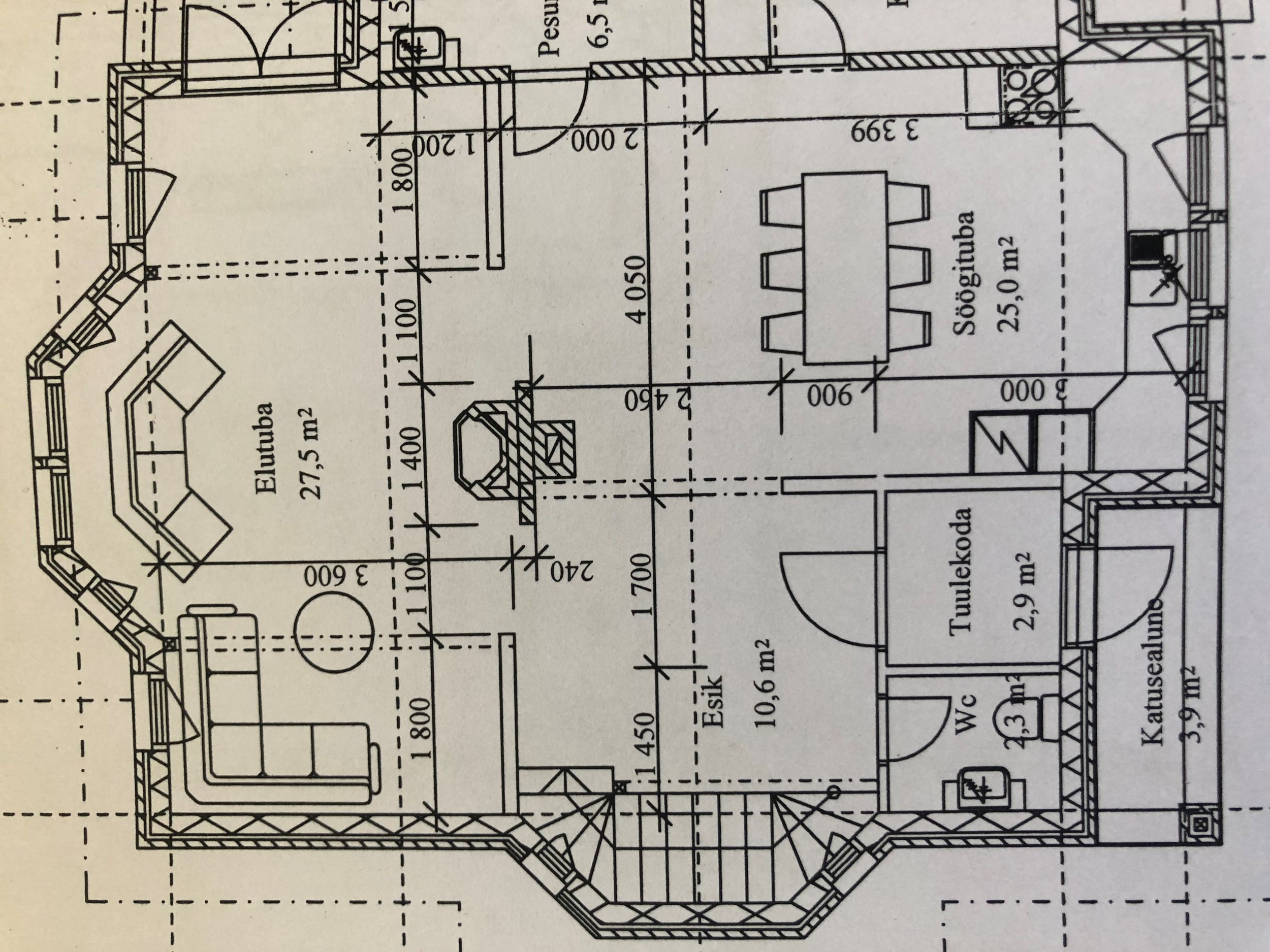 Elutuba, esik ja söögituba - joonis manuses, kus pinna mõõdud.