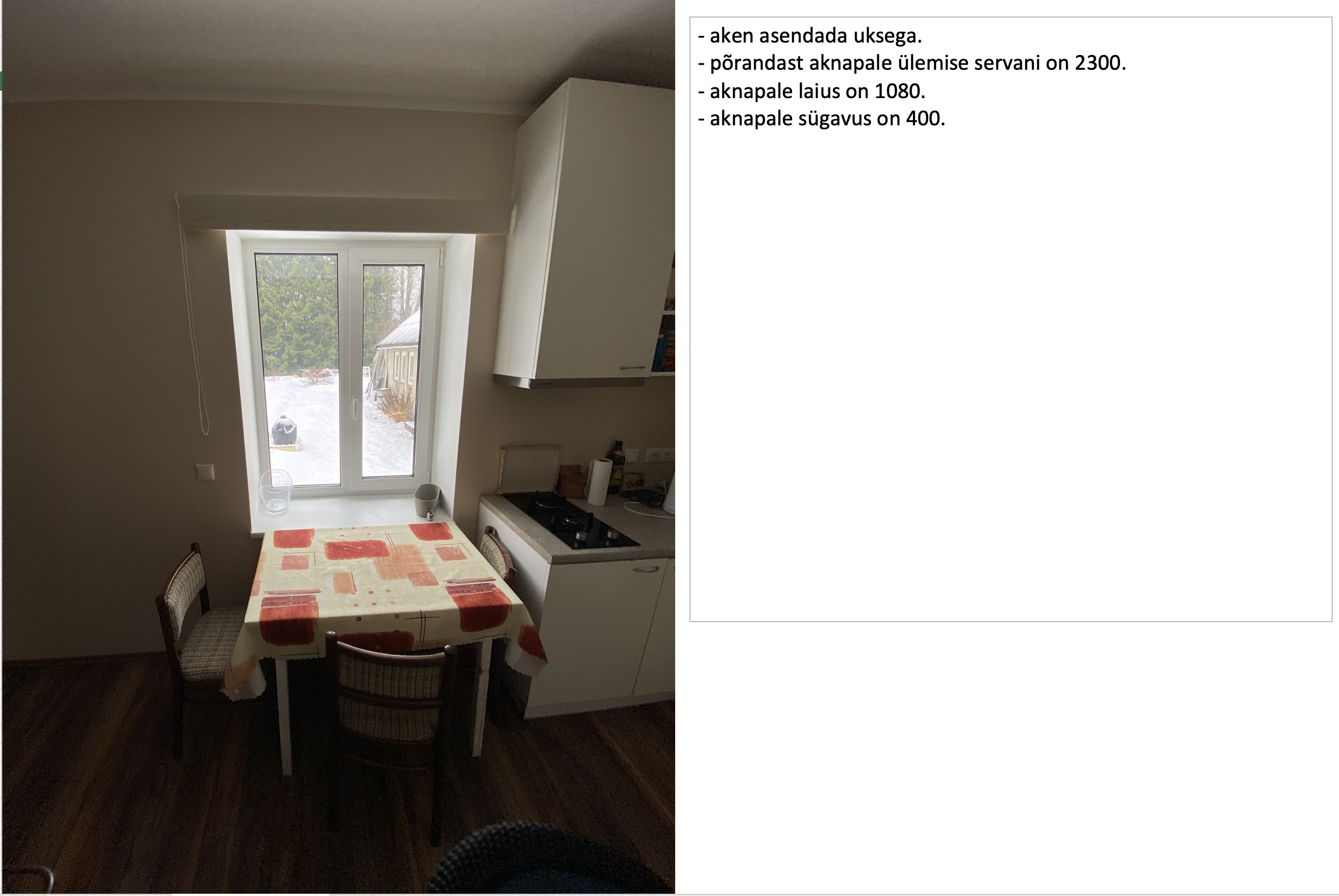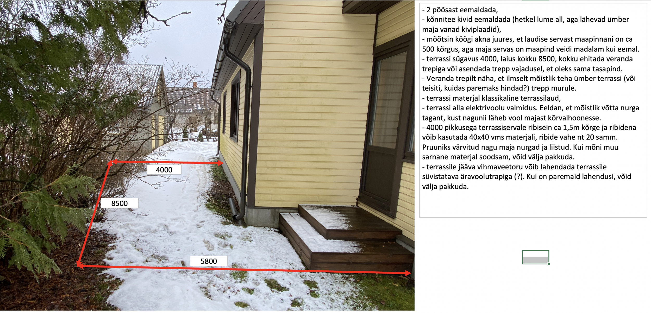 1) Köögi akna asendamine terrassiuksega (mõistlik ilmselt teha kahene uks, mis avaneb külgedele ja keskel posti pole) ja terrassi ehitus vastavalt joonisele. Uks samasuguse tegumoega nagu aknad (plastikprofiiliga, väljast pruun, seest valge), terrassilaud võib olla klassikaline terrassilaud (ei pea olema termotöödeldud). Lisainfo lisatud joonistel. Ehitusjäätmete äravedu.