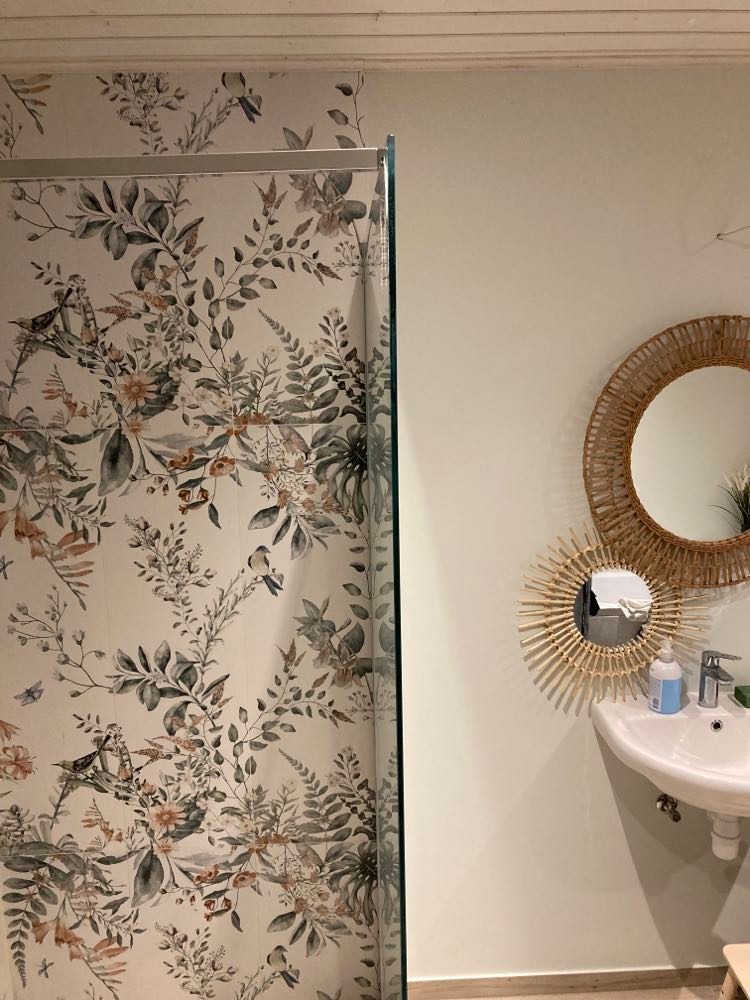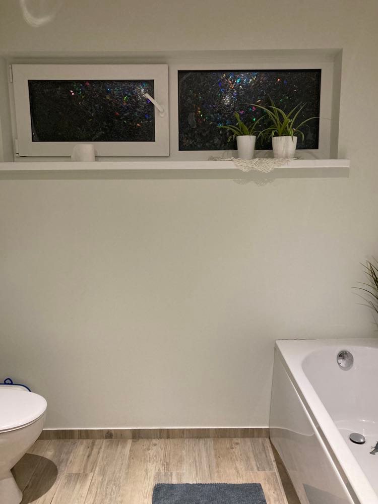 Vannitoa seinte, 24 m2, plaatimine. Plaadid Shiro White Matte 33x111x1. Hetkel seinad värvitud, plaaditud vaid duššinurk plaadiga Shiro Bloom 33x111x1.