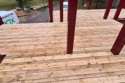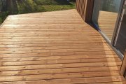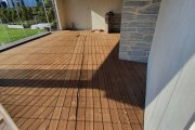 Vundament Fibo plokkidele. Geotekstiil alla. Pruun immutatud terrassilaud (28x145 või 28x120). Sile pool üles. Peidetud kinnitus.