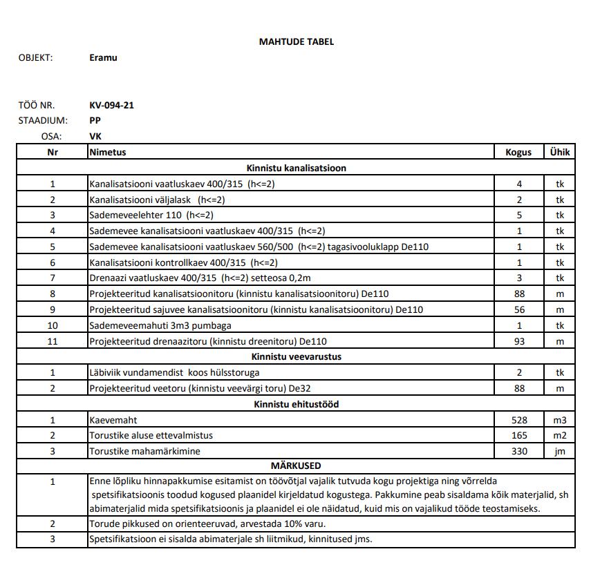 Pakkumise kirjeldus: Tere! Hind sisaldab käibemaksu! Hind sisaldab vee, kanali, sadevee ja drenaažitöid koos kõikide materjalidega ja teostusdokumentatsiooniga. Hinnas ei sisaldu elektritööd, roksoni tööd ega katendite taastamine- neid pakume eraldi kokkuleppe alusel. Ettemaks materjalide eest, aga vajadusel võime sõlmida lepingu ja tasumistingimused läbi arutada. |