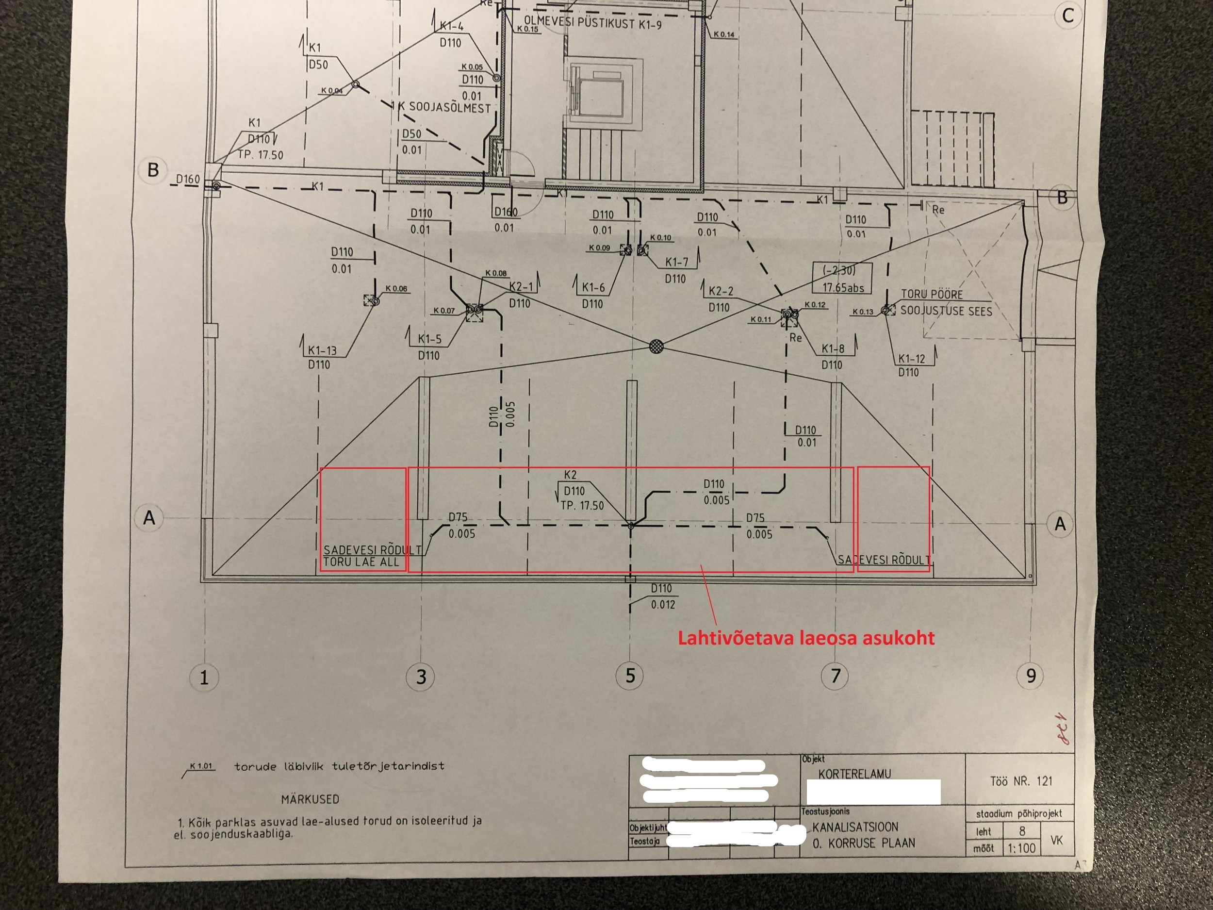 Seoses sadevee püstaku lekkega on saanud lagi veekahjustusi ja tuleks eemaldada osaliselt kipsplaat ning vill, korrigeerida sadevee torustik (paigaldada ühenduskohad kokku tagasi) ja taaspaigaldada materjalid/ asendada osaliselt uuega.