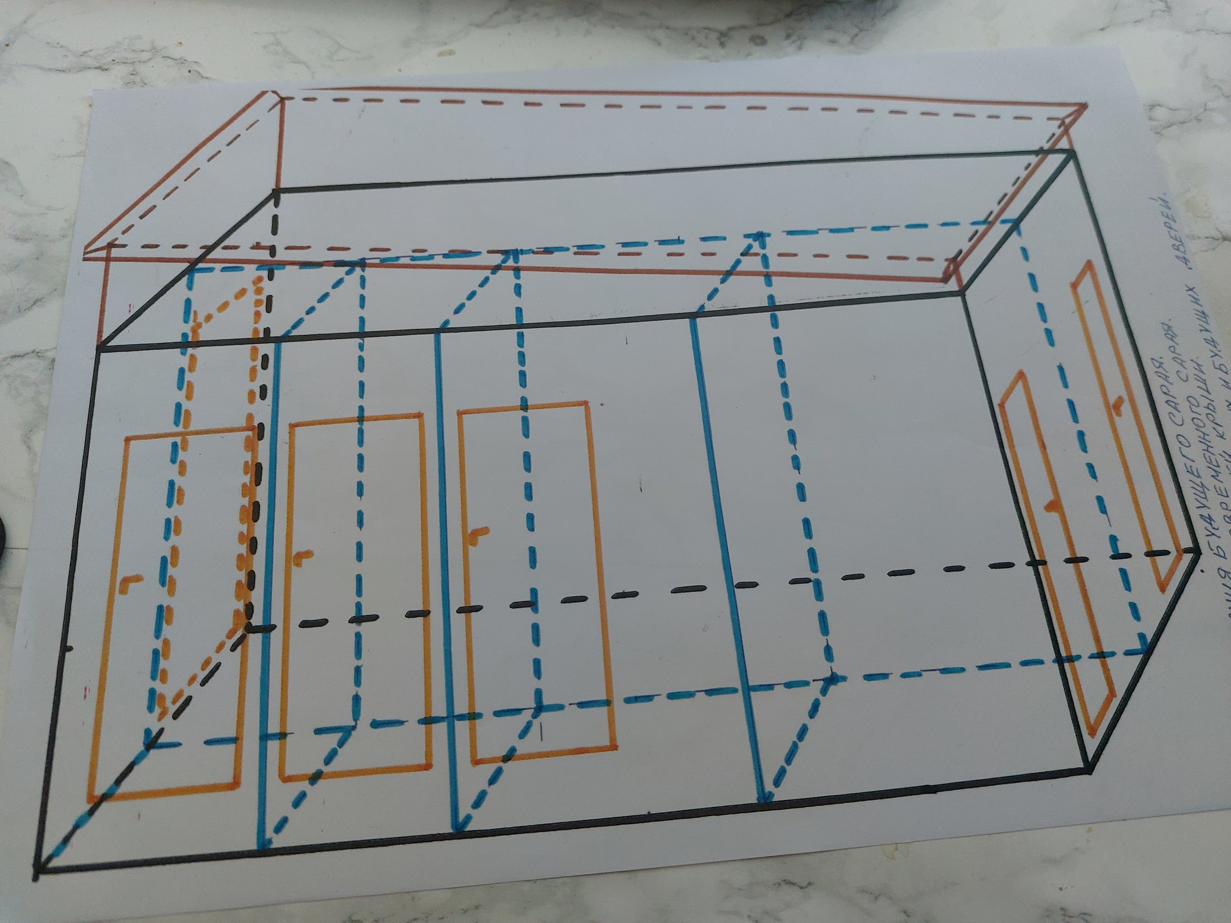 Garaaž-kuur kaks ühes, mõõdud (p*l*k) 12m*9m *2m +katus kõrgus (ühekaldeline), betoonist vundament, puittarind, peale lähevad cedral paneelid. Katusele plaanis paigaldada päikesepaneelid.
