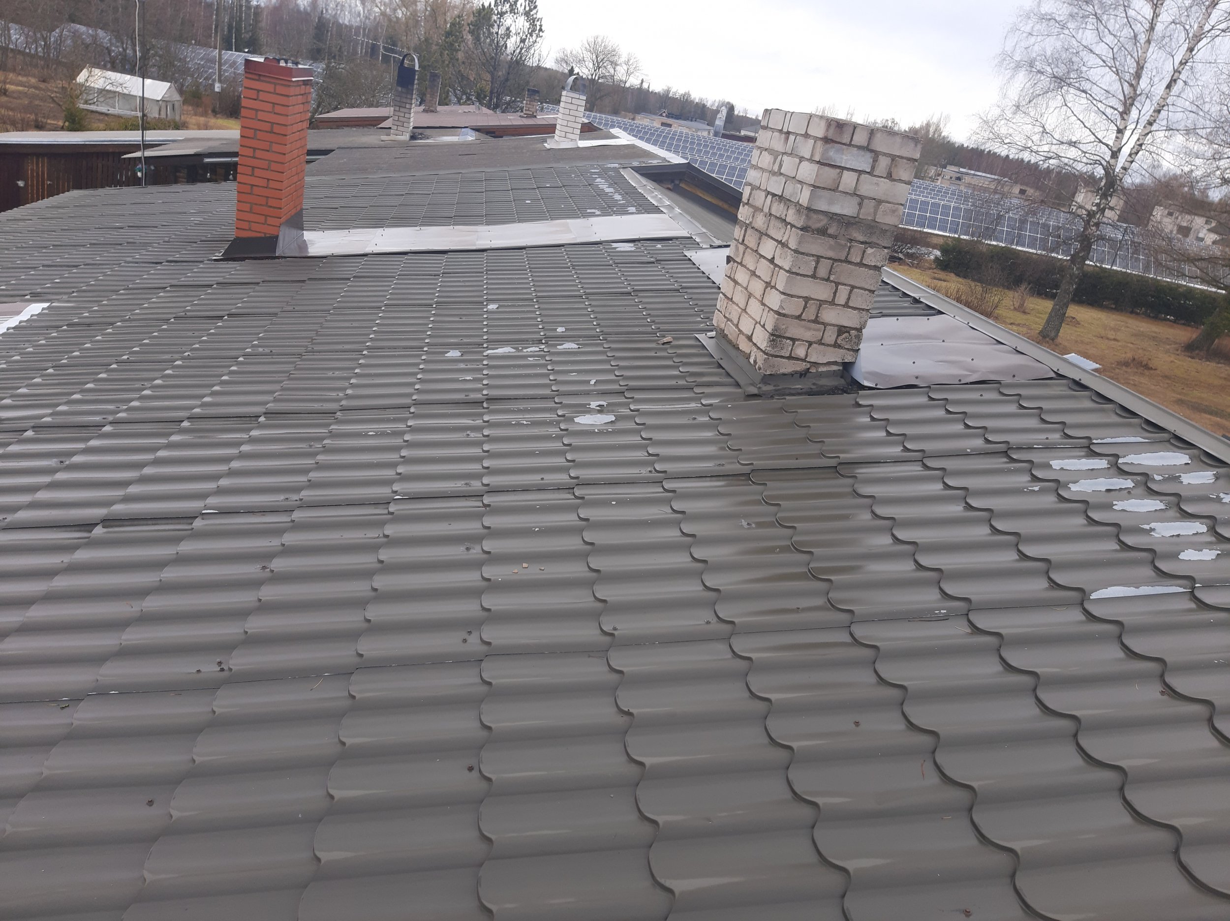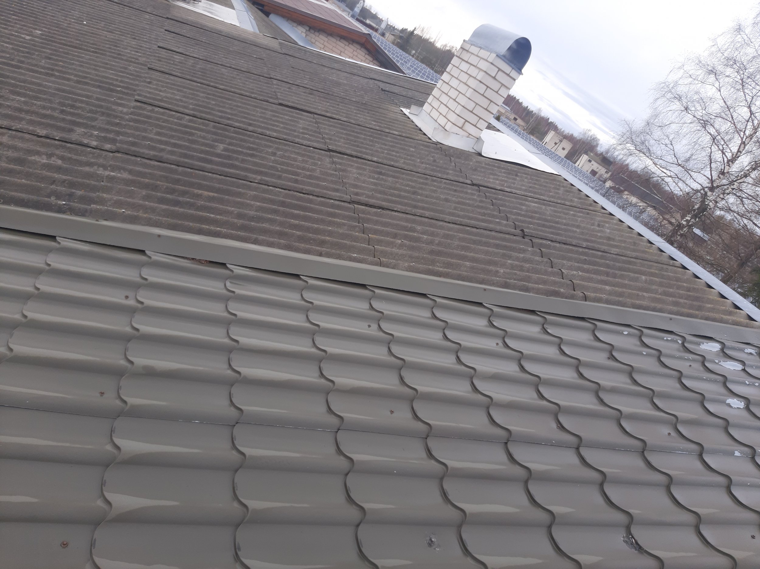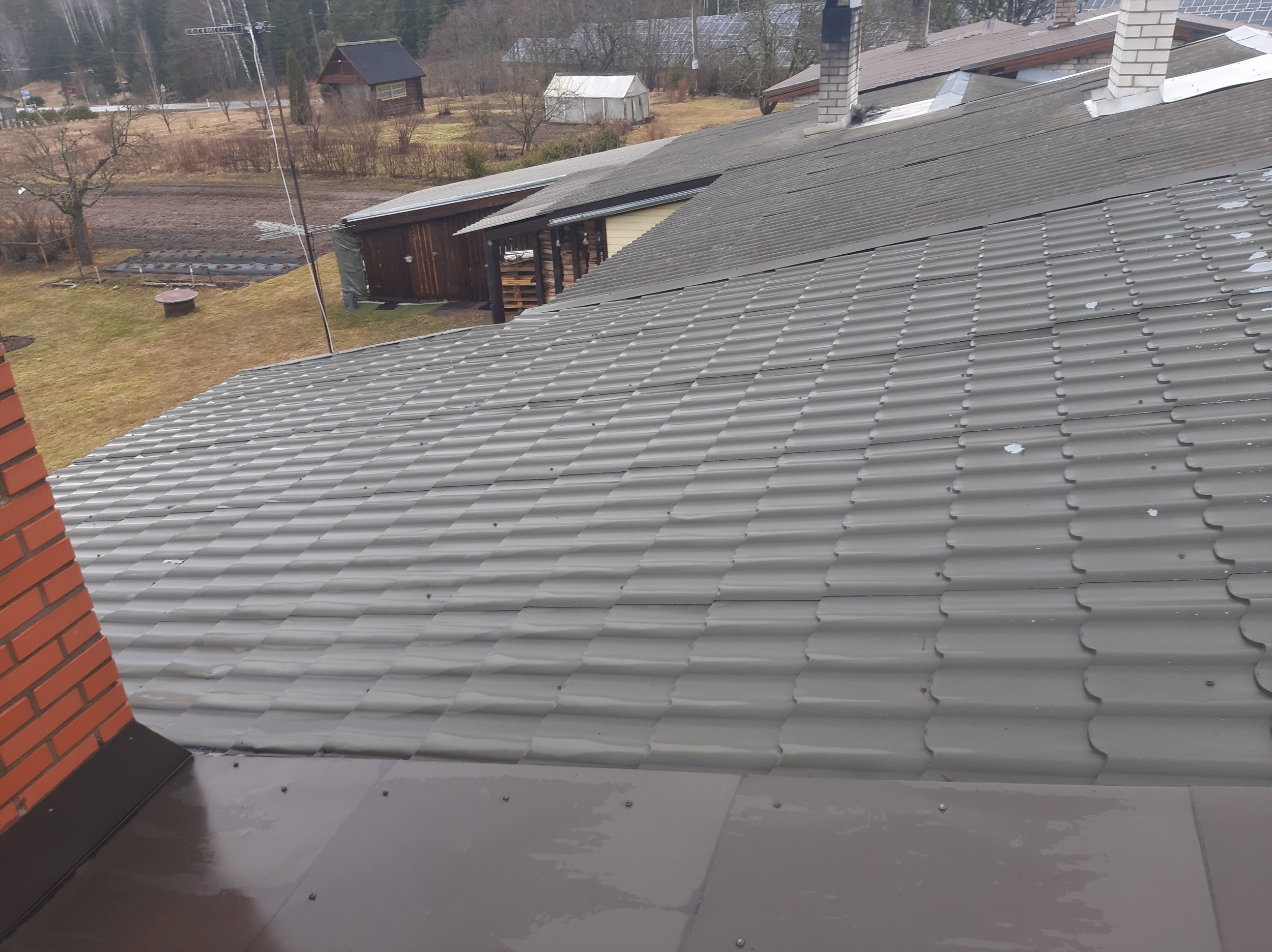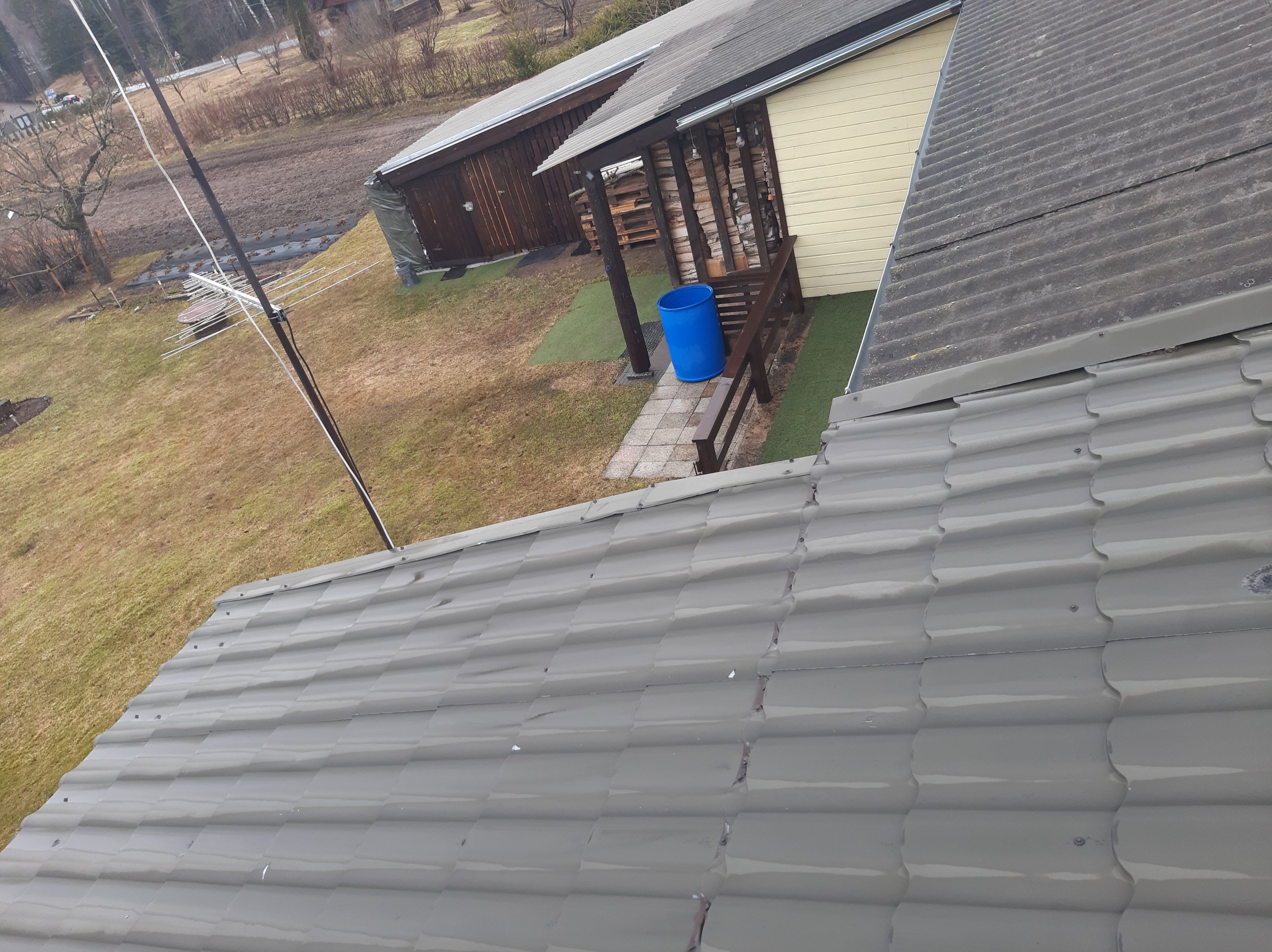 Soovin vahetada katusekatte uue vastu, soojustada katusealuse ja panna mõned päikesepaneelid(autonoomne-võrguga liitumatta)Tuulekaste ära ei lõhu,kuna praegusel katusekattel puudub aluskate siis selle paigaldusel ja rihtimisel tuleb ilmselt tuulekaste kõrgemaks ehitada.Katuse rihtimisel tuleb ilmselt harja pikkust muuta,seega külgmised tuulekastid tuleb uued teha.Katusekatteks tuleb samamoodi kiviprofiil plekkkatus(pruun).Kuna tegemist on ridaelamu boxga(1x),siis naabrite katusest tuleb see ilmselt veidi kõrgem ,ilmselt vaja otsaplekiga kokku viia.Terassil asendame ka vana katte uue vastu(uus olemas ja samade mõõtmetega).Praegused vihmaveesüsteemid eemaldame ja paneme hiljem tagasi(Paigaldatud 3aastat tagasi uued) õige kõrguse peale.Tuulekastid värvime üle.Paigaldame mõned,lumetõkked , ventilatsiooni korstna,ja katuseluugi(3 aastat tagasi paigaldatud uus ,kui saab paneks selle tagasi) ning natuke päikesepaneeli.Ühe korstna sooviks plekiga üle lüüa ja teisele paigaldaks katusesilla.