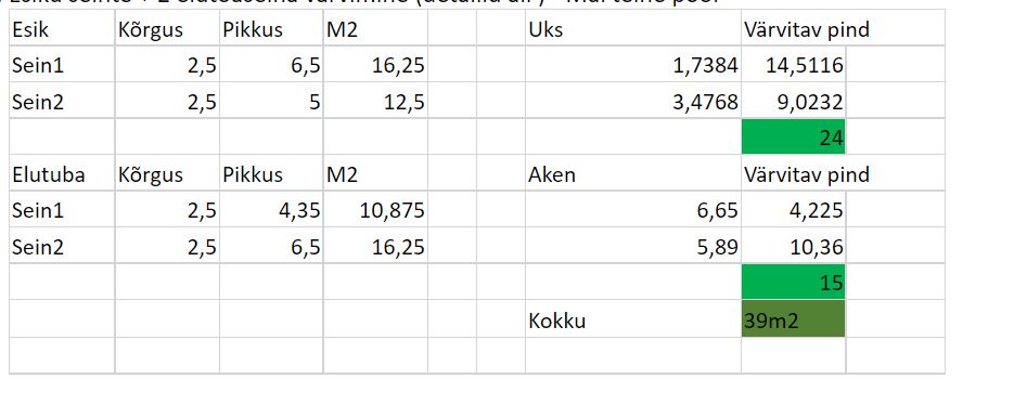 Esiku+ elutoa seinte värvimine 39m2 (koos vajalike kohtparandustega, probleemsetest kohtadest pildid-Seintel on probleemsed kohad esikuseinas ( mõnest kohast värv lahti ja mõnest kohast praegune värvikiht kantud ilma pinda korda tegemata ) . Kahes aknapõses on värv kummis. Lisaks veel mõned üksikud väiksed täkked.).