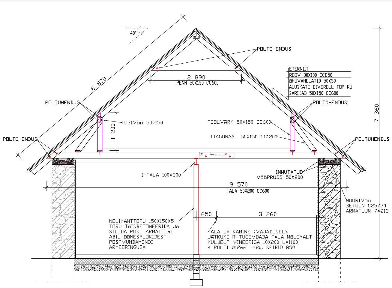 Soojustatud põrand, metallpostid ja -talad, puitfermid, soojustatud vahelagi, eterniitkatus jne.
