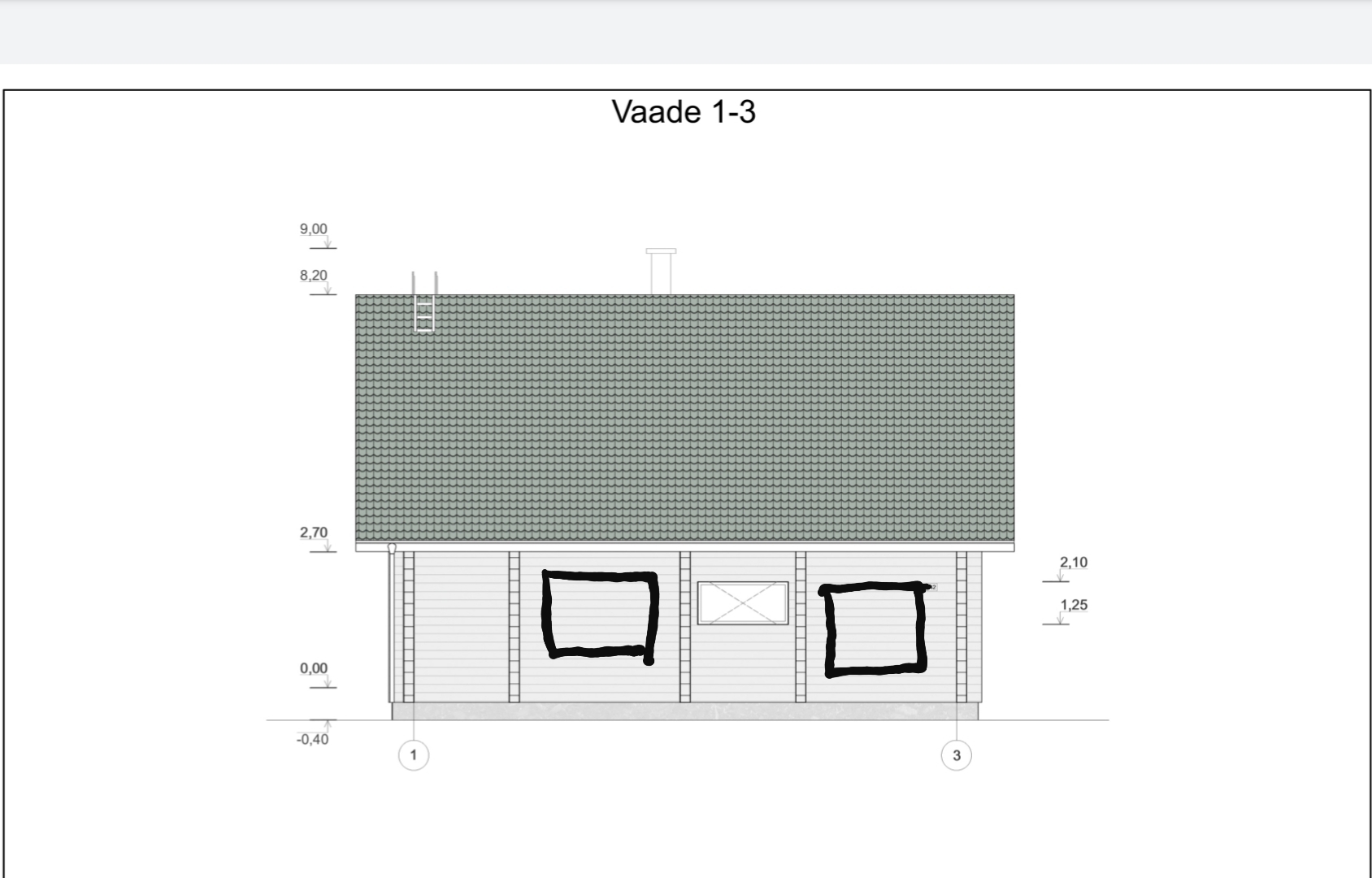 Esimese korruse seinad freespalk, teisel korrusel puitkarkassil laudis. Esimesele korrusele lõigata 3 ava akende jaoks, lisada tenderpostid, mõõdud täpsustamisel.