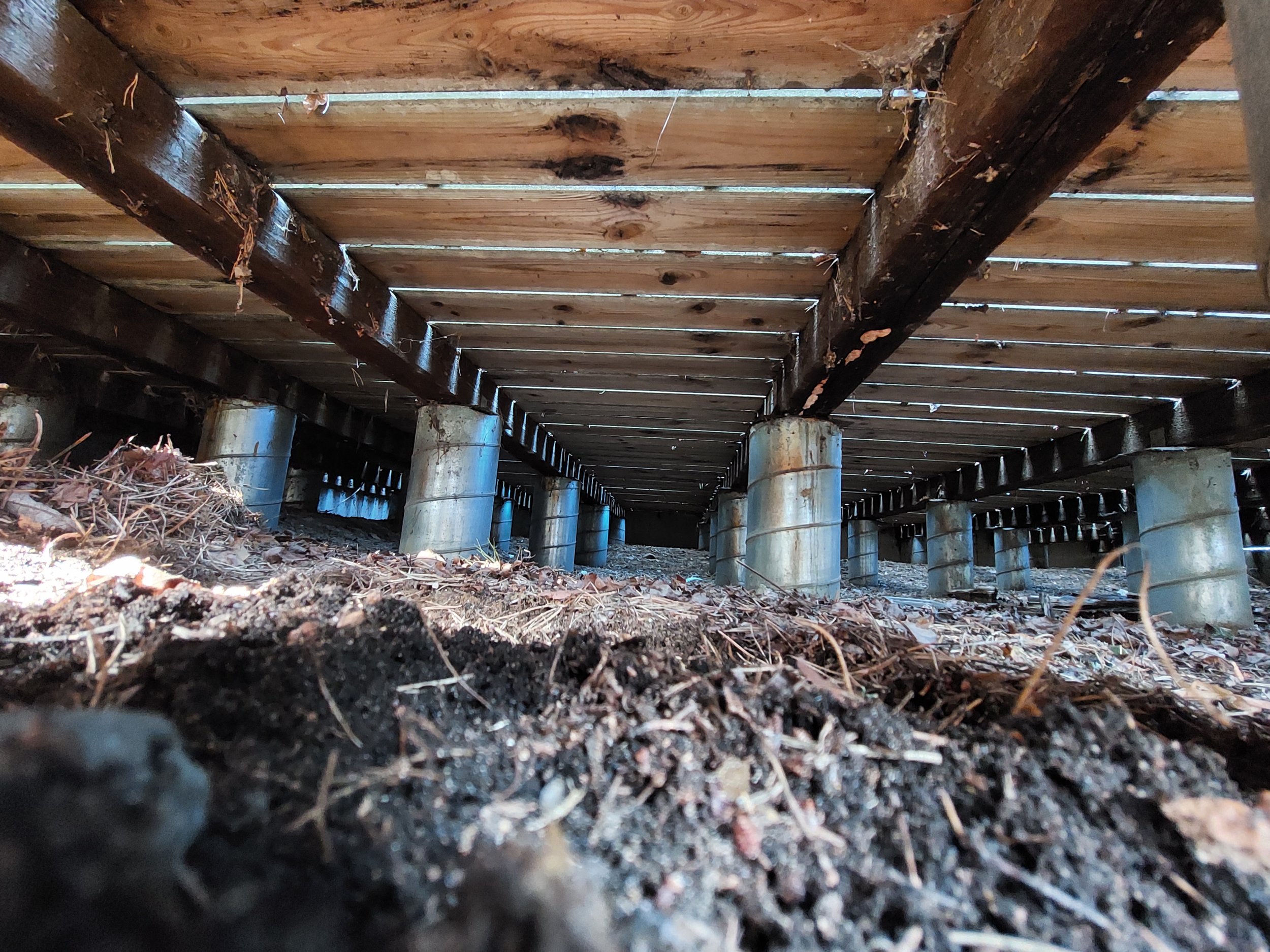 Kogu puitkonstruktsioon toetub ventilatsioonitorude sisse valatud betoonpostidele, mis on lauaga ristipidi umbes 1 m sammuga ja pikkipidi 0,8 m sammuga kogu terrassi all. Sellest tulenevalt on prussid üksteisest 0,8 m kaugusel.
