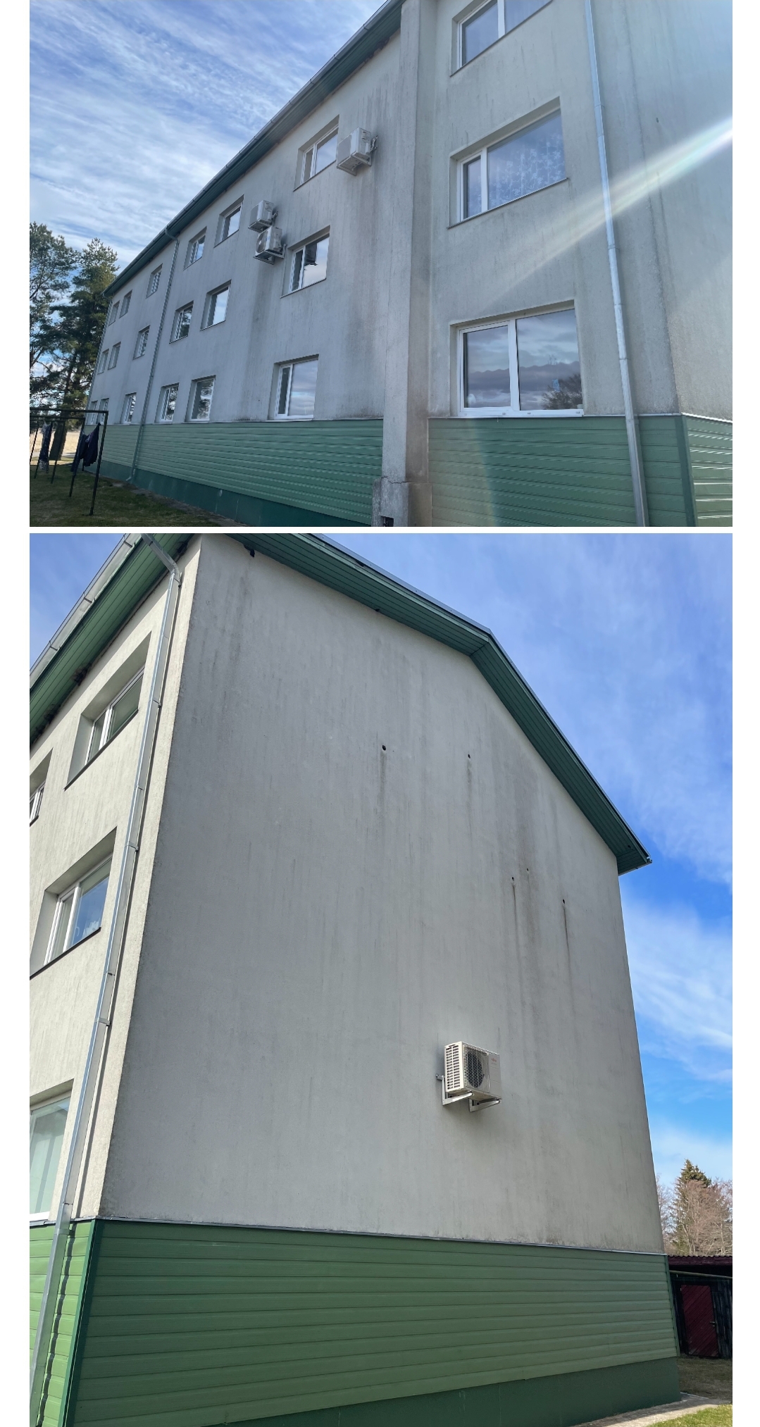 - spetsiaalse biotsiidi pealekandmine enne kõrgsurvepesu - fassaadi pesemine kasutades kõrgsurvepesurit - fassaadipesu järgne biotsiidi pealekandmine, et tulemust kestaks aastaid - akende pesemine kasutades klaasipesuvahendit, survepesurit ning kuivatamine - sokliosa pesemine kasutades survepesurit - varikatuse puhastamine biotsiidi ja survepesuriga - kogu vajaminev varustus (tõstuk, pesur jne) on meie poolt. Lisamärkused: - tööde teostamiseks on vajalik vee ja elektri kasutamise võimalus - kulutused tarbitud vee ja elektri eest on tellija kanda juhul kui pestav pind on juba kahjustunud (mõranenud, lahtine) siis puhastuse käigus võivad need kahjustused laieneda Maksmine arve alusel kui ka sularahas kohapeal |
