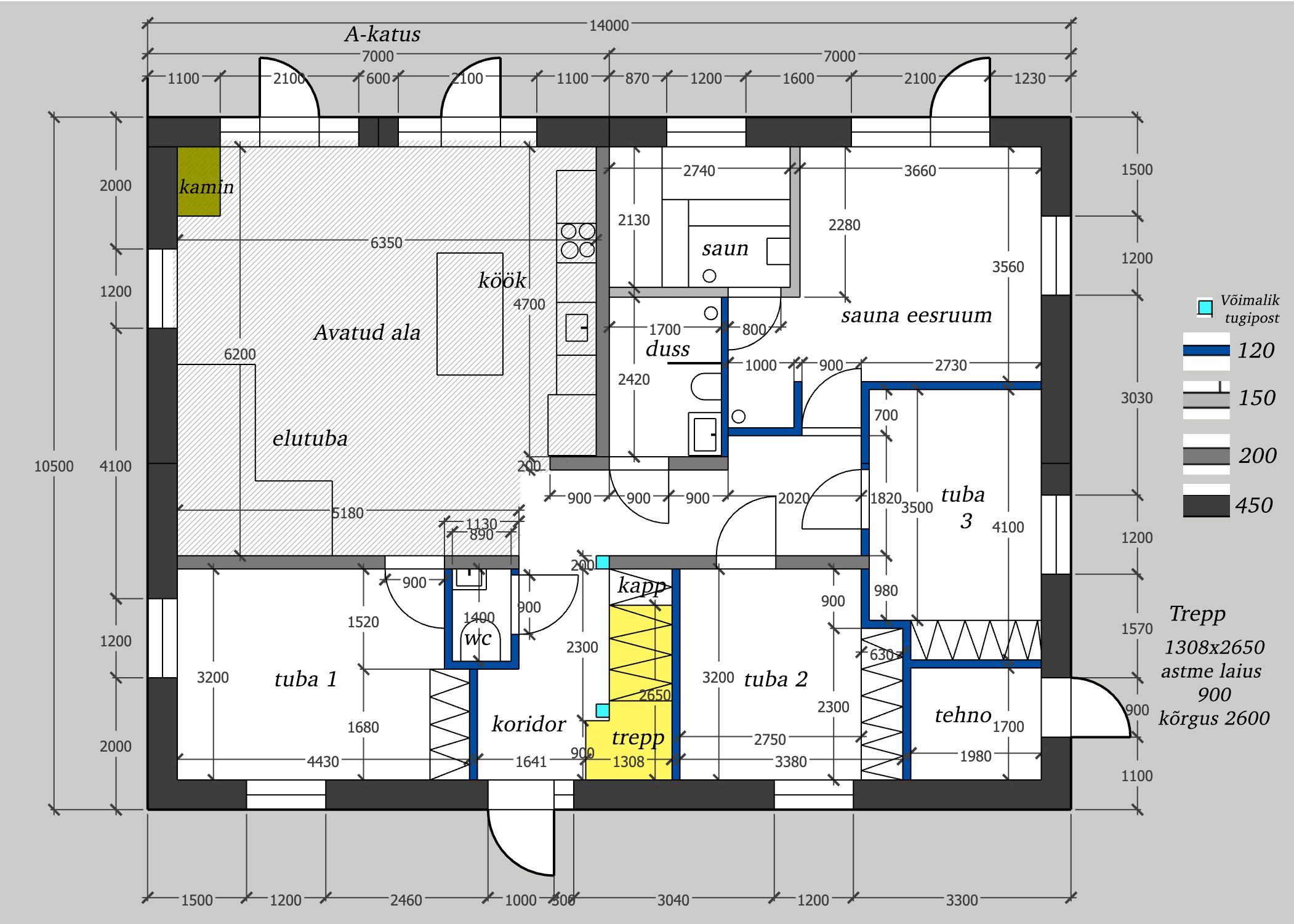 Uue maja projekt vastavalt projekteerimistingimustele, elumaja projekt eelprojekti staadiumis, sissesõidutee ja aias olev tee tagumiste hooneteni.