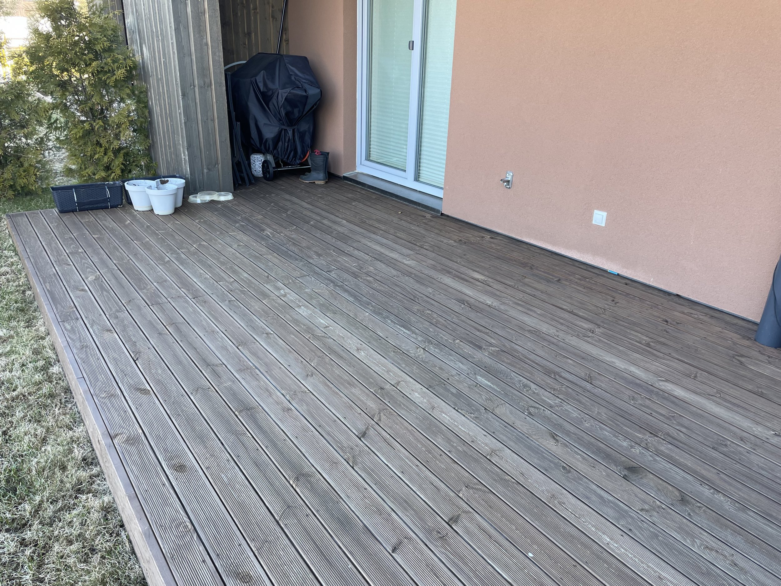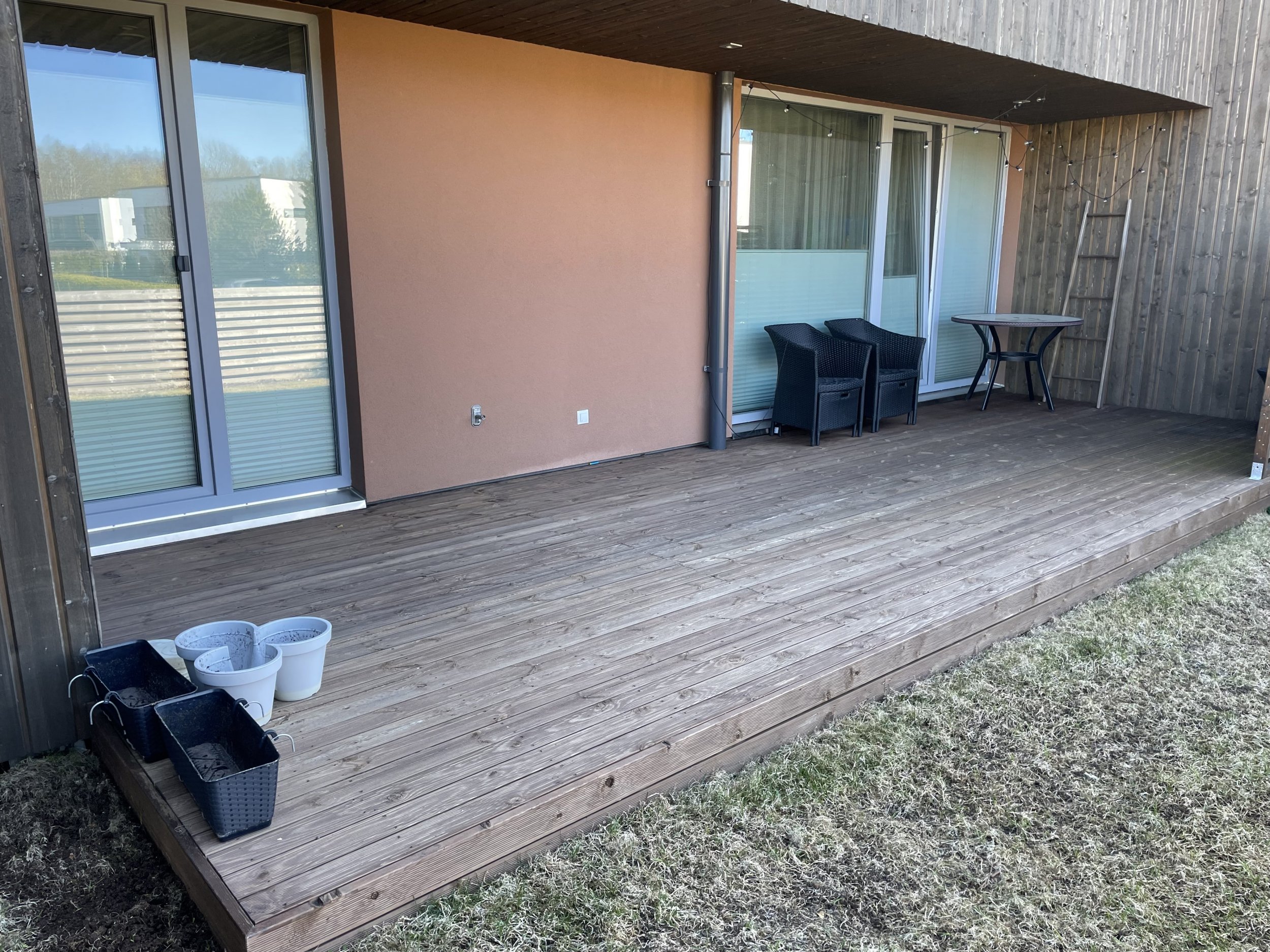 Kokku 6tk x 6m terrassilaua (93 mm x 15 mm) vahetus. Seejärel terrassi õlitamine. Pruun, uued lauad ilmselt siis 2 x ja vanad lauad peaks piisama 1 x.