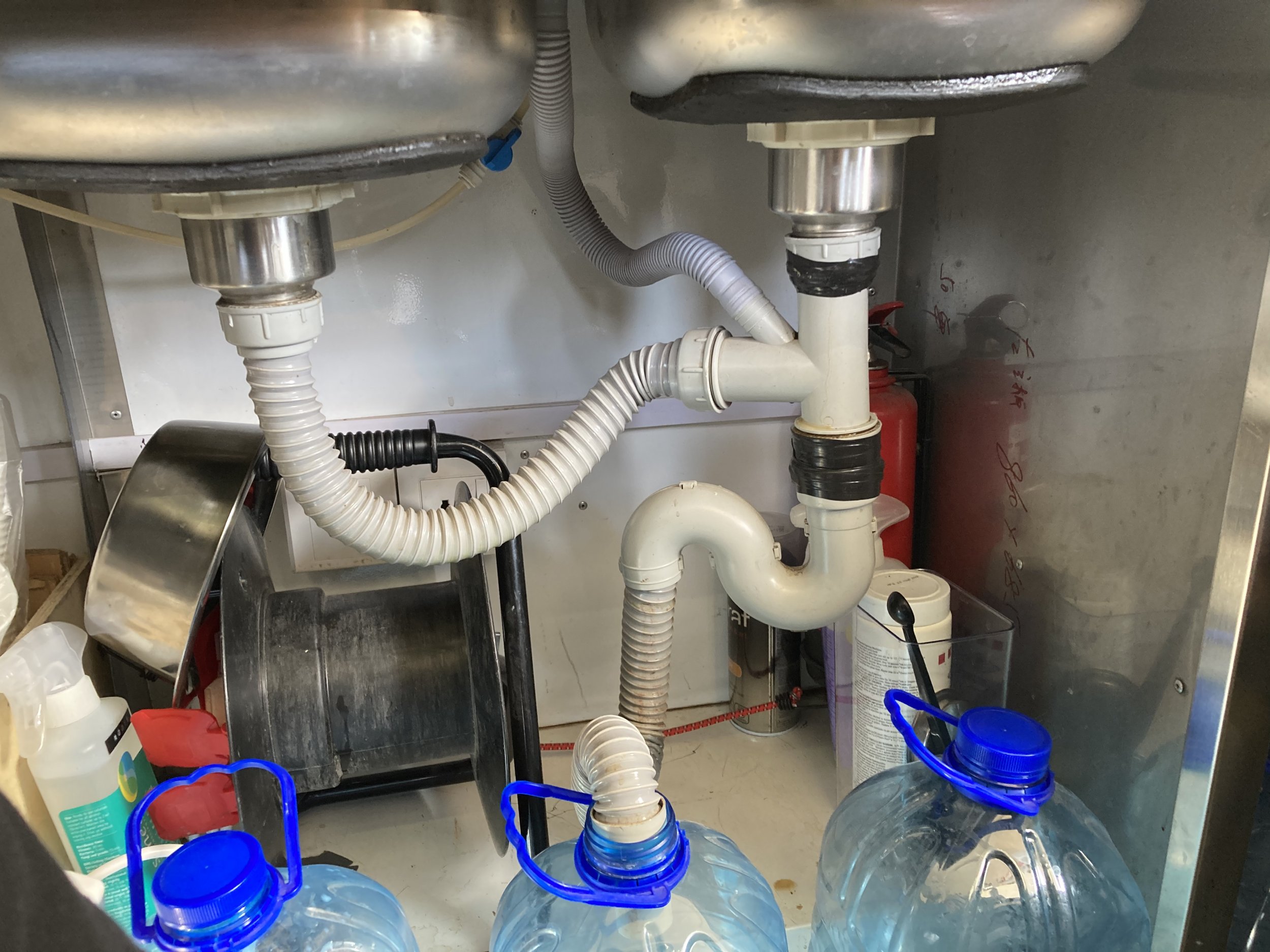 Mobiilses müügikioskis vajab vahetust/remonti lekkiv kraanikausi äravool. Must vesi kogutakse kanistritesse. Vaja oleks see äravool teha lekkekindlaks.