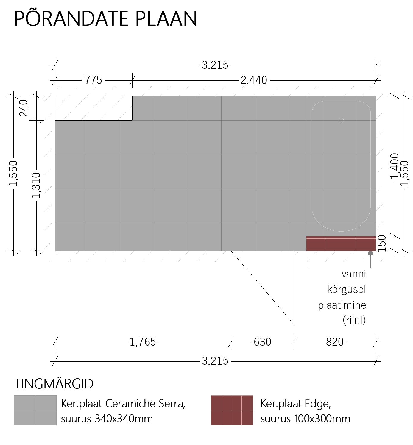 On vaja plaatida keraamilise plaadiga põrand ja osaliselt seinad. Plaatimis joonis on olemas. Mööbel ja sanitaartehnika toas puudub. Kõik on valmis plaatimiseks.
