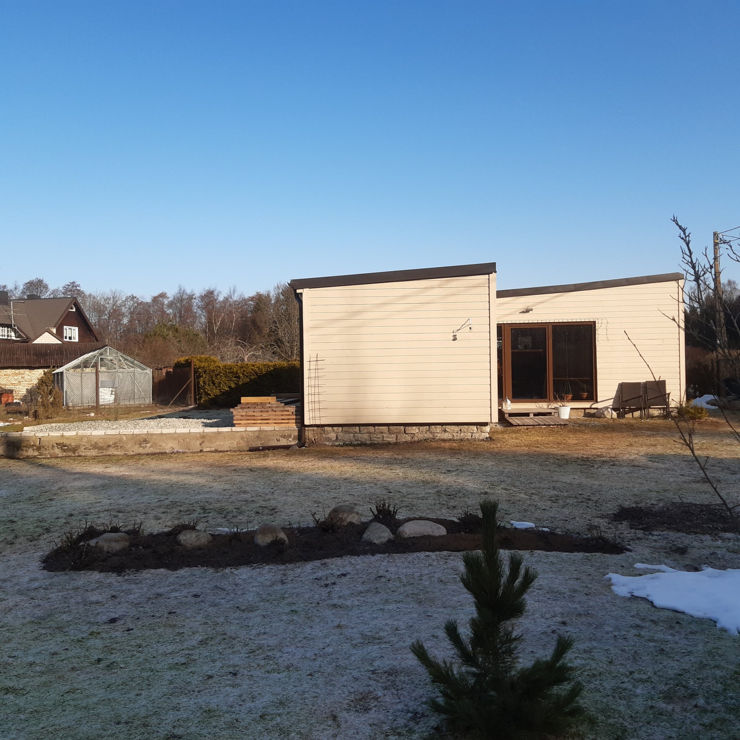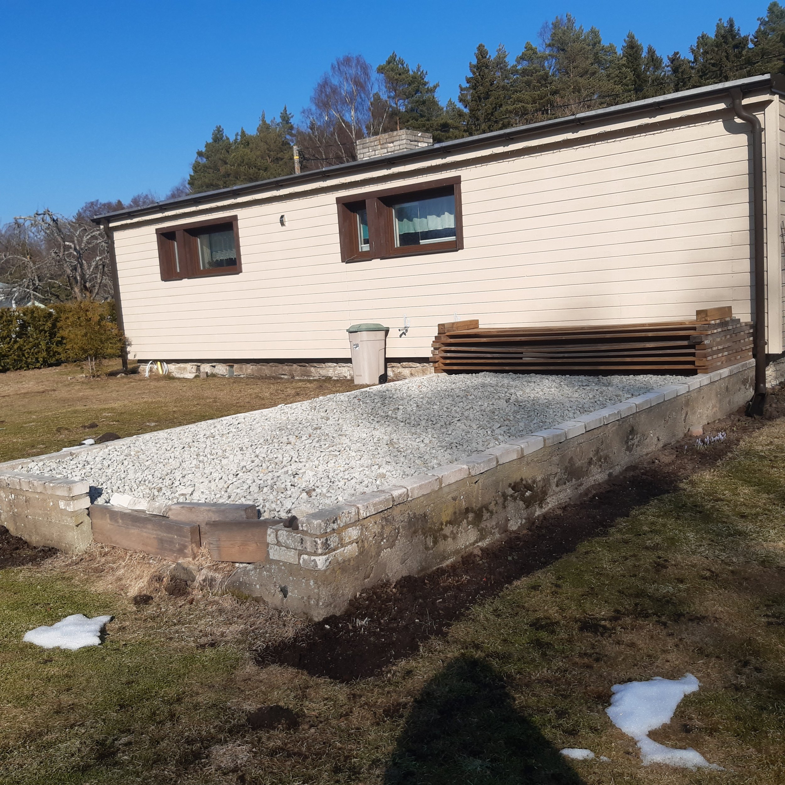 1. terrassipind 4,5m x 5,4m ja trepiaste , kokku 25 m2. Ühel pool vundamendist alus, ülejäänud Fibo plokkidest. Alla geotekstiil. Terrassilaud pruun immutatud 28x120 või 28x145. Peidetud kinnitus.