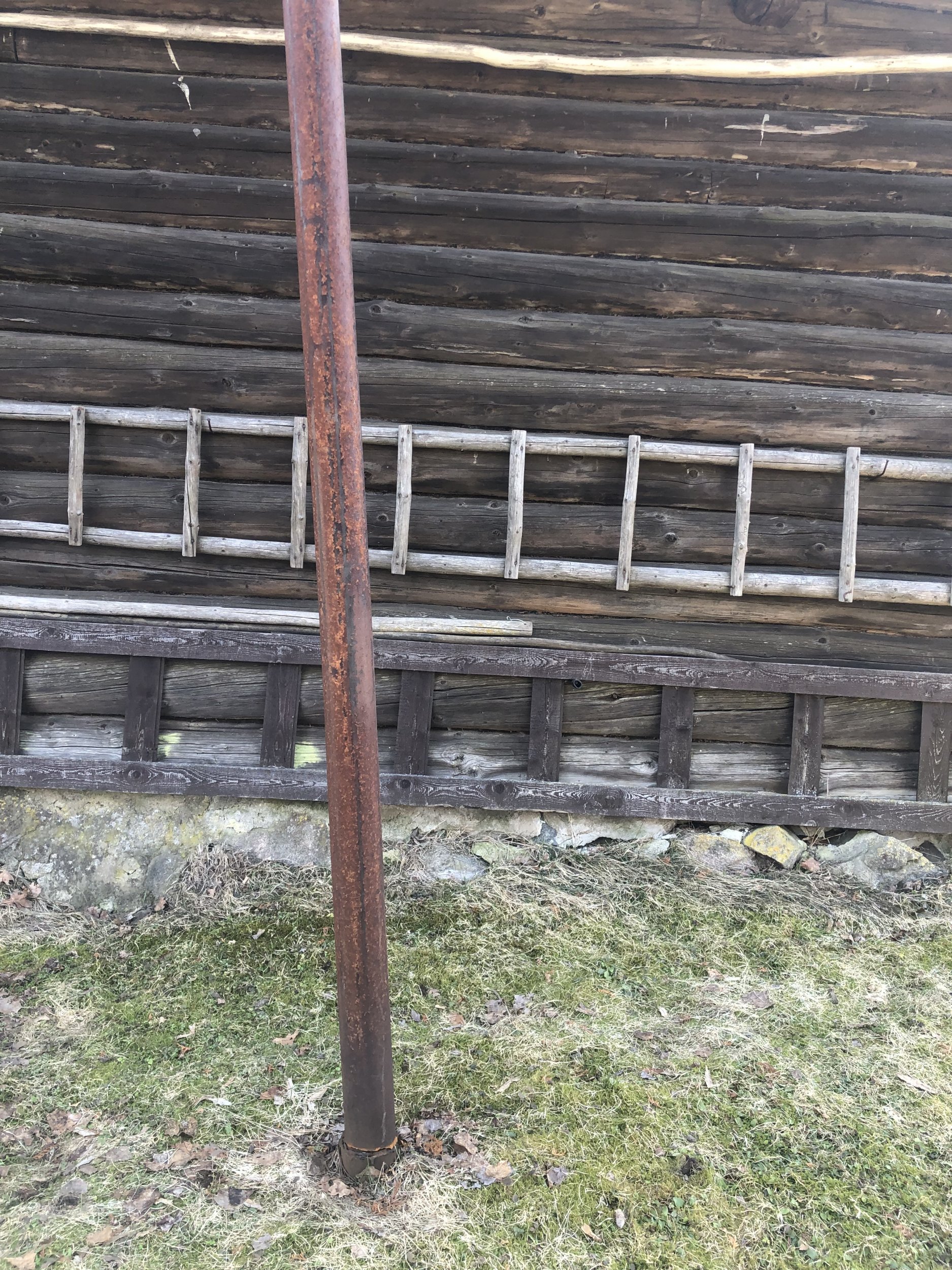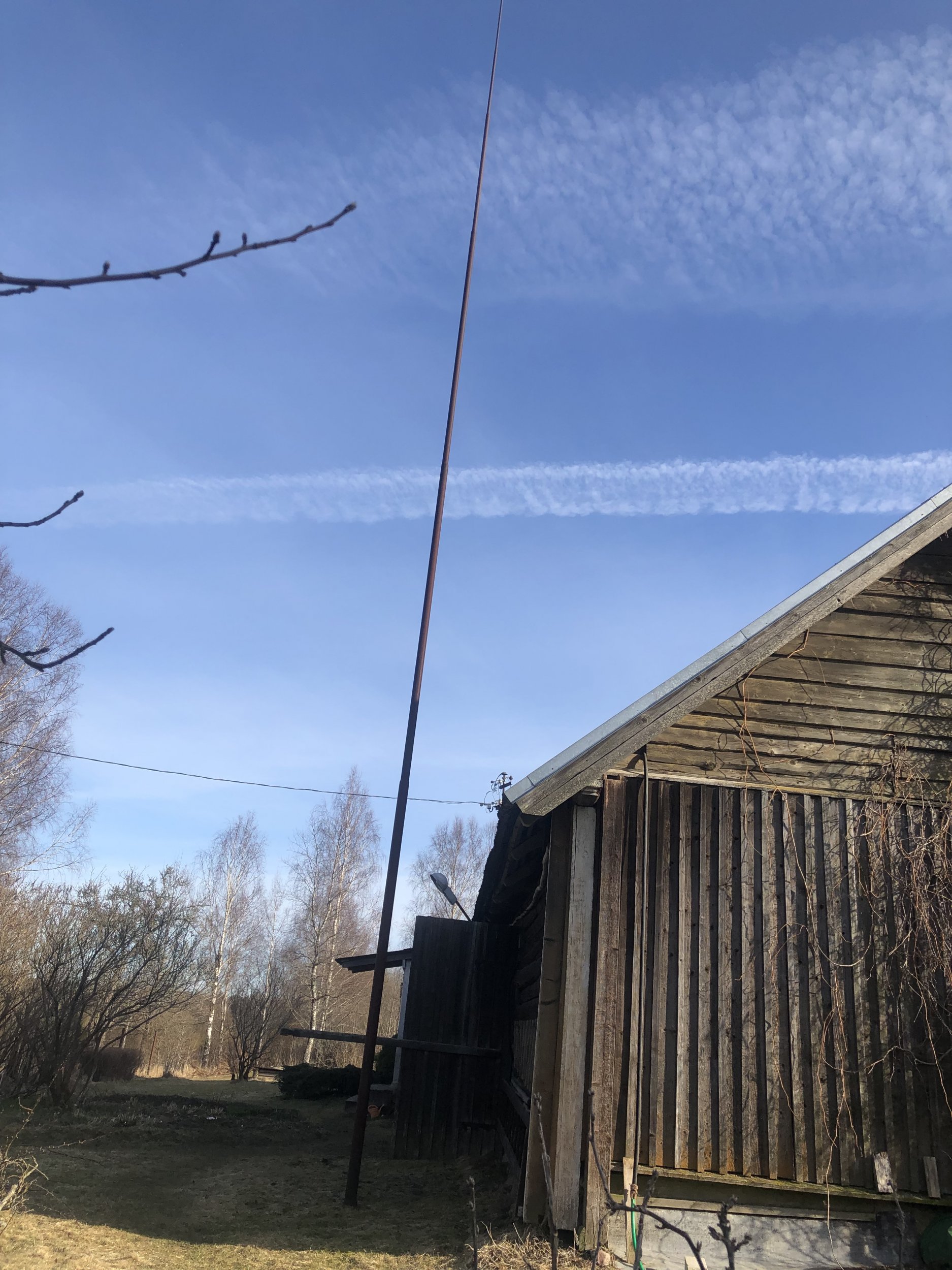 Ca 30m kõrguse (hoone kõrval seisva, veidi viltu vajunud) metallist piksevarda lammutamine. Kõue, Harjumaa.