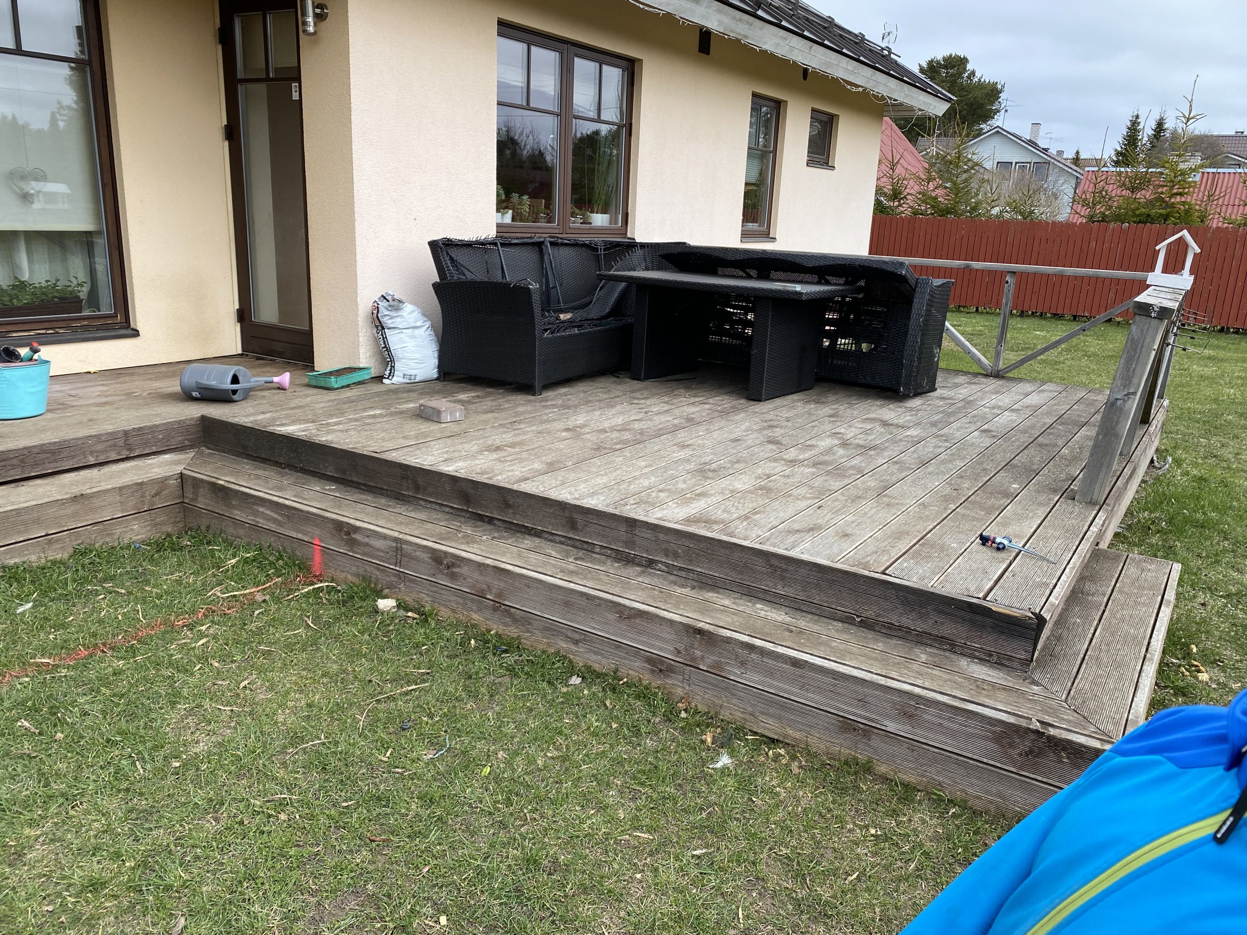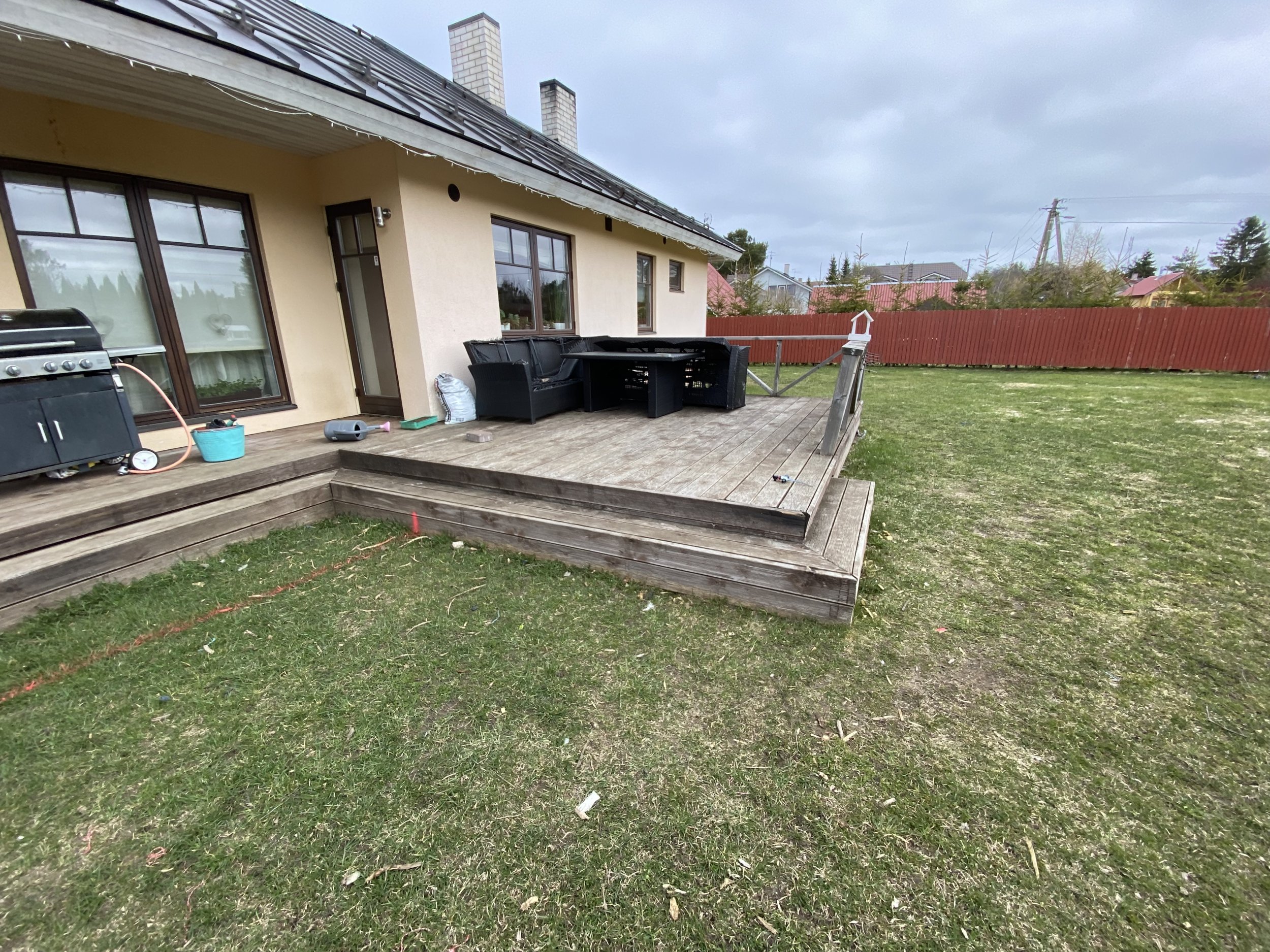 Vana terrassi laudise eemaldamine ning uue paigaldus. Uue terrassi osa ehitus. Ka kõikide piirete ja asmete ehitus.