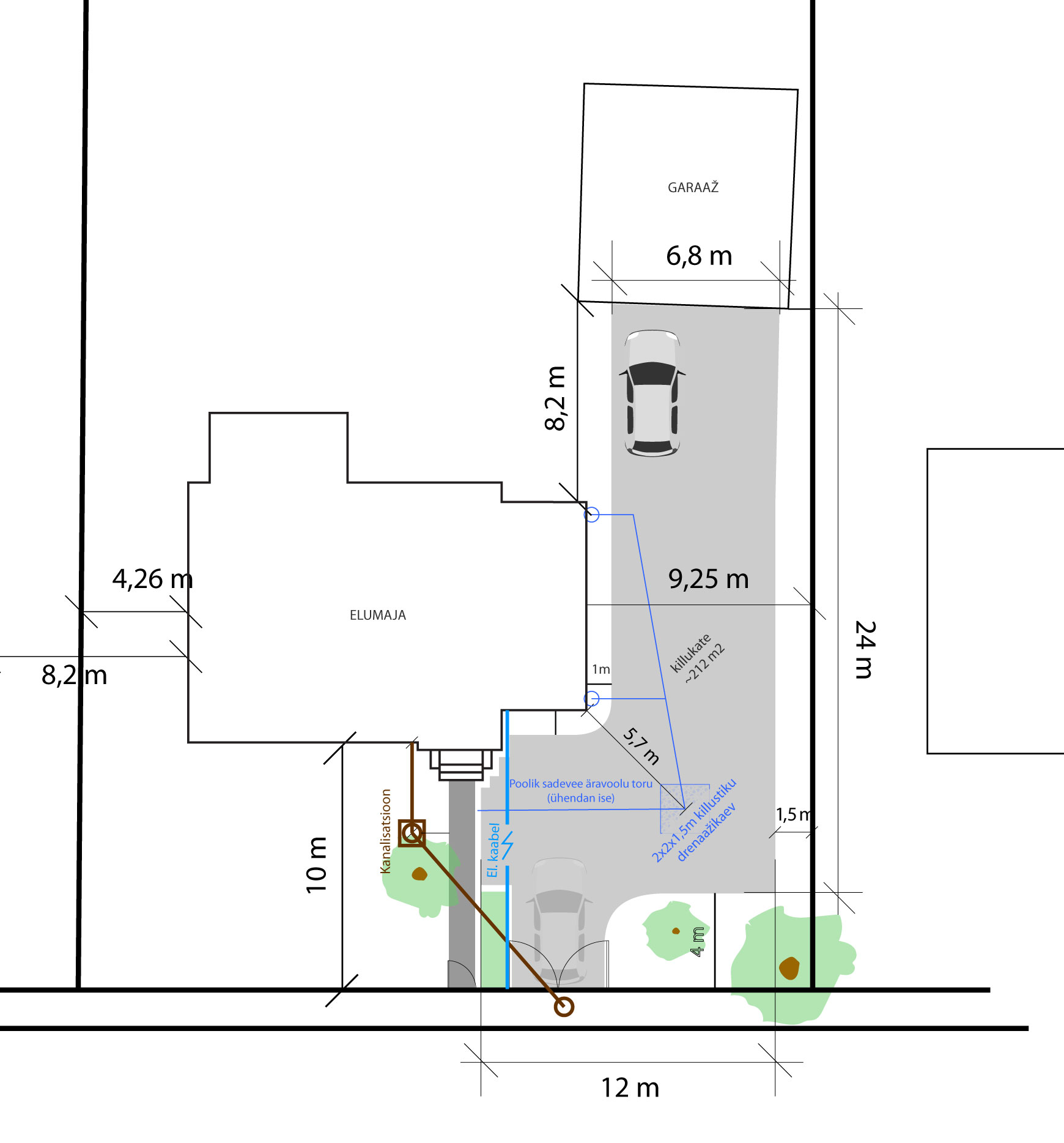 Drenaažikaevu joonisel tähistatud kohtadesse sadeveetorude vedamine