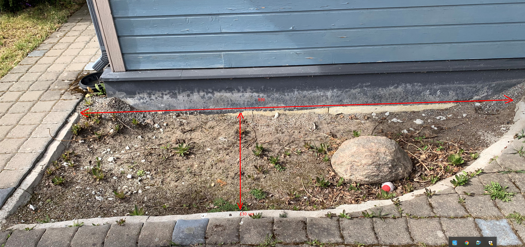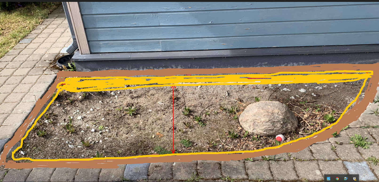 Minu soov oleks tellida maja küljes olevale peenrale ümber klombitud paekivitükkidest piire, 5-7 cm üle kõnniteekivi, et muld ei tuleks välja peenrast. Piire vajab ka vundamendi valamist, vastu maja kindlasti (kollane), millele see paekivi laduda (pruun).