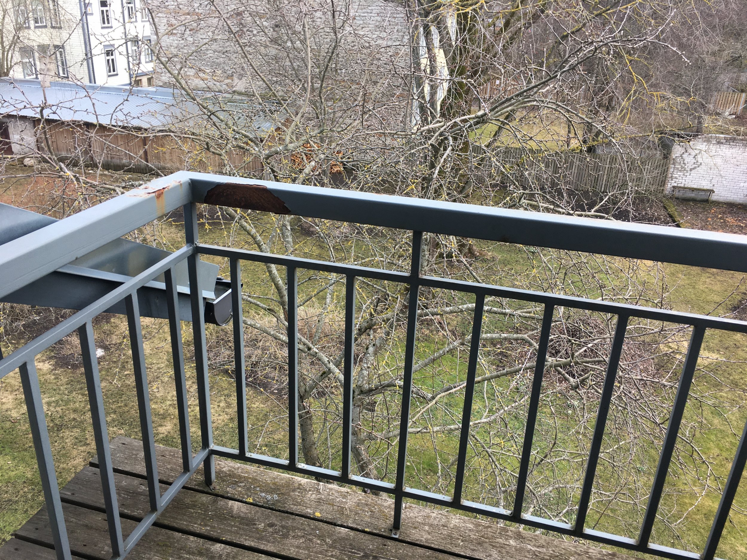 b) maja kuue rõdu metallist piiretel koorub värv. Vana värv ja rooste maha ning üle värvida.
