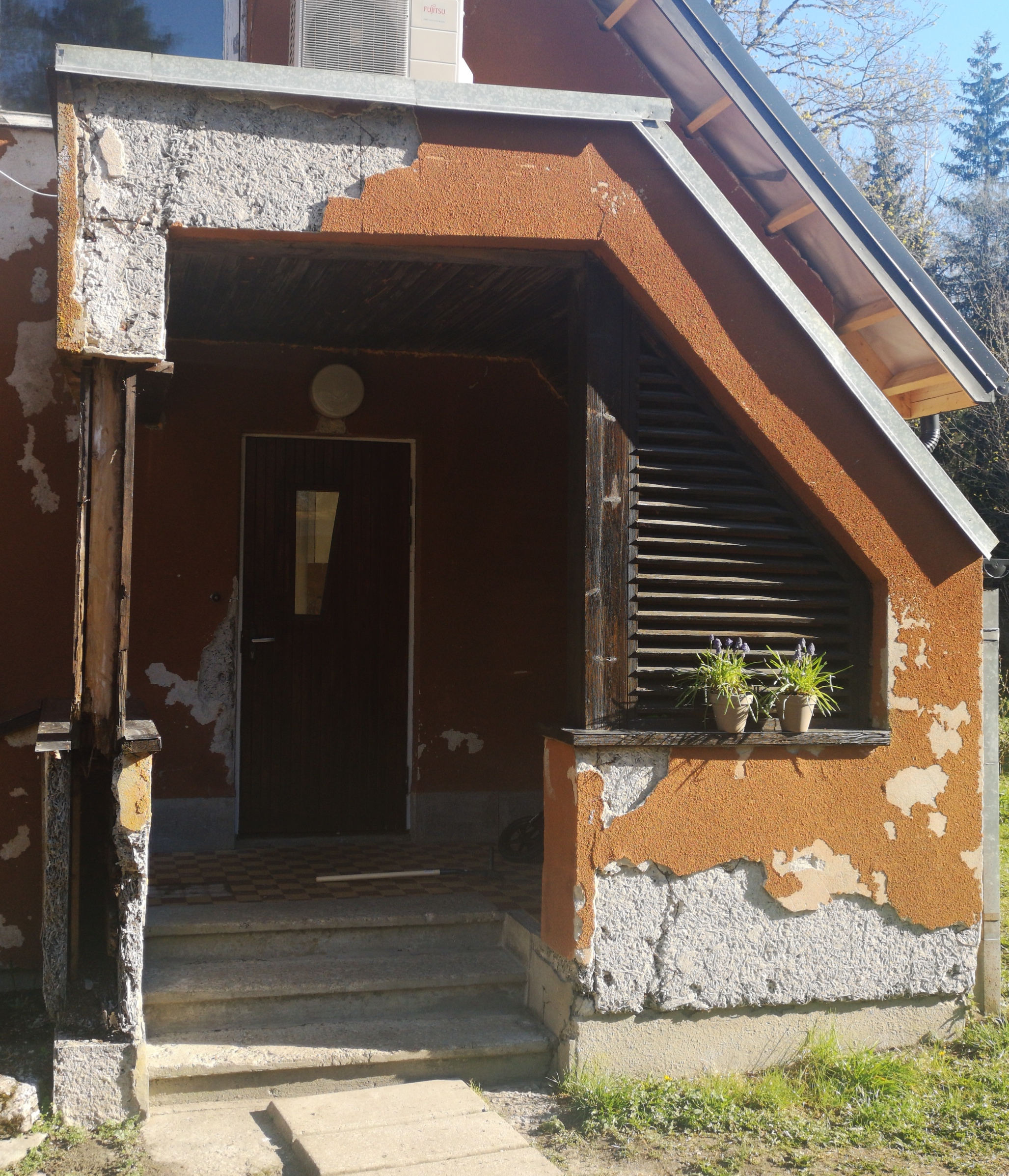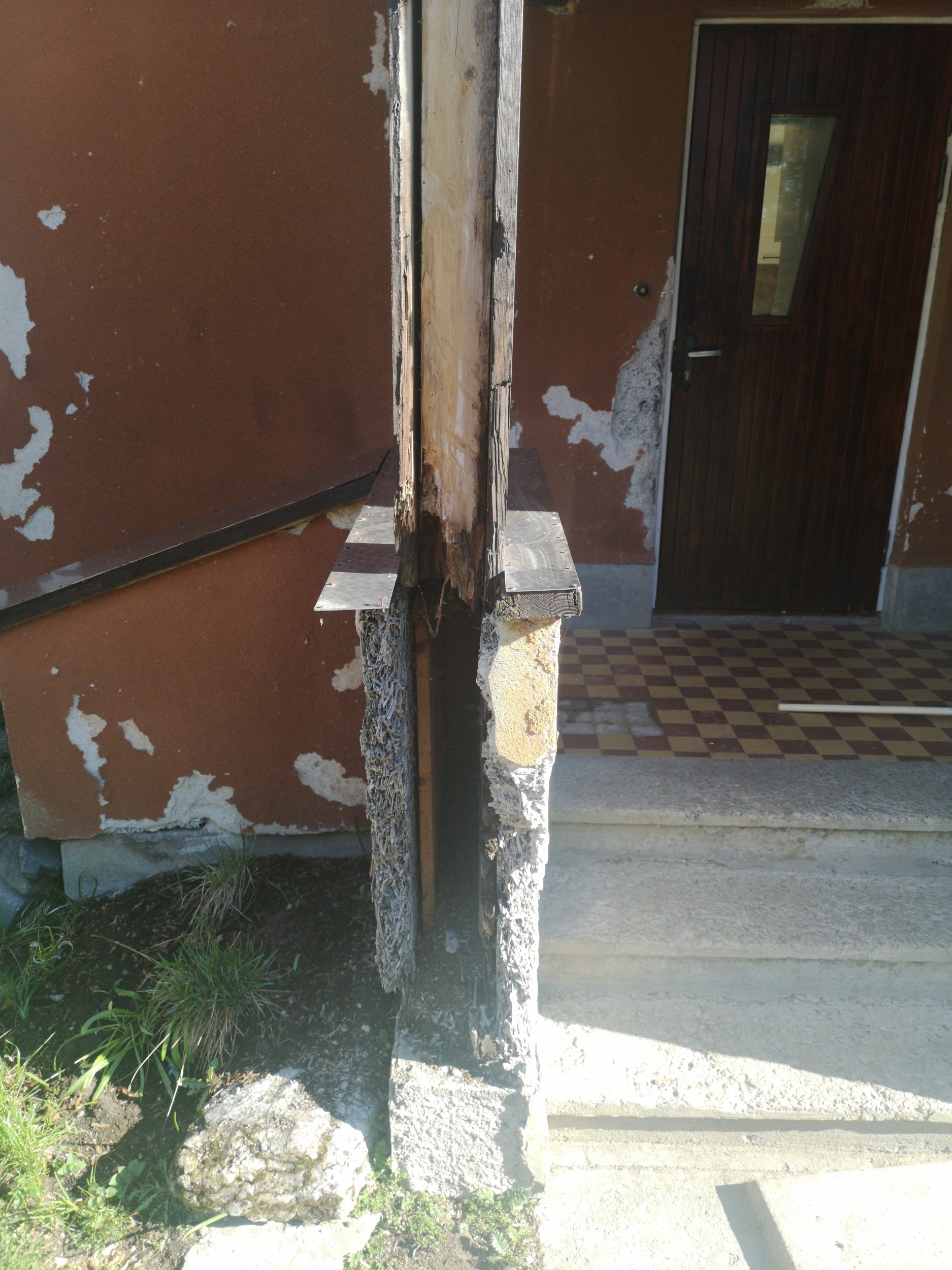 Vana toestusposti mädanenud osa ära lõikamine. Katuse tõstmine paari cm näol ja palgi paigaldamine uueks toestuspostiks.