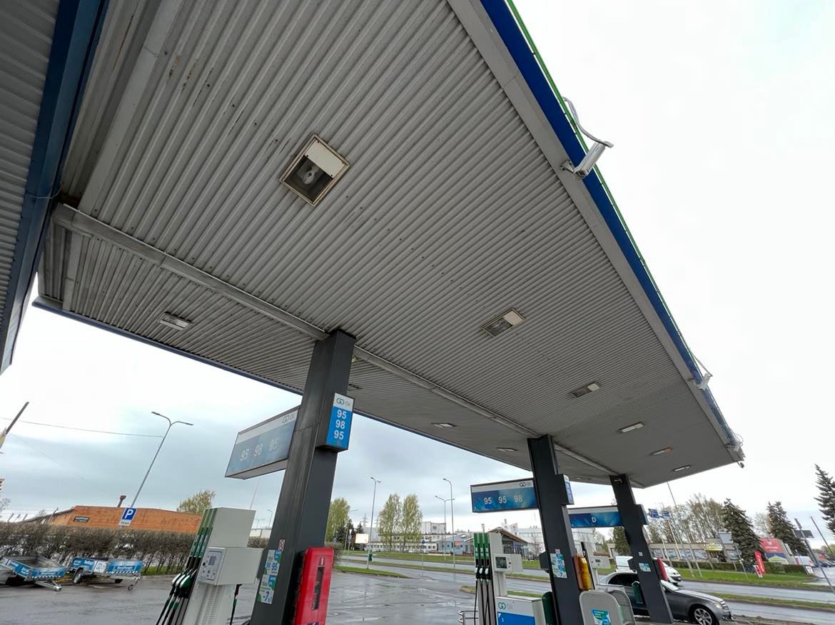 Tankla profiilplekist varjualuse värvimine pritsiga öisel ajal. Värvitavat pinda on umbes 250 m2 ja värvitoon jääb samaks.