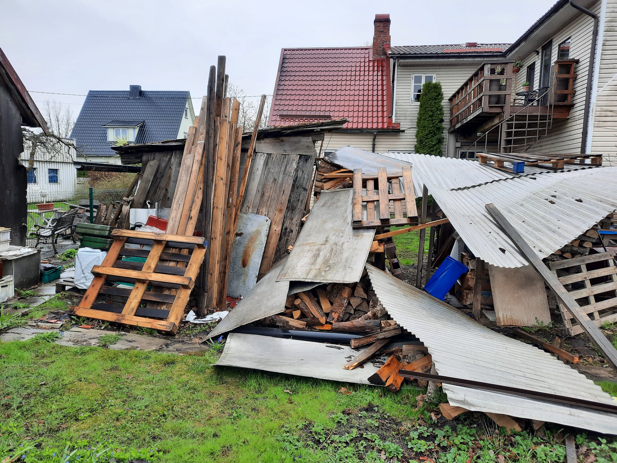 Vana puukuuri (30m2) lammutamine, äravedu ja utiliseerimine vastavalt kehtivatele reeglitele (eterniit eraldi jne.). Hetkel kuuri küljel olevate ajutiselt laotud puuriitade ladumine aia teise külge (ca' 6 ruumi). Ideaalis ka vabaneva põletamiseks sobiva puitmaterjali pliidipuudeks saagimine ja ladumine.