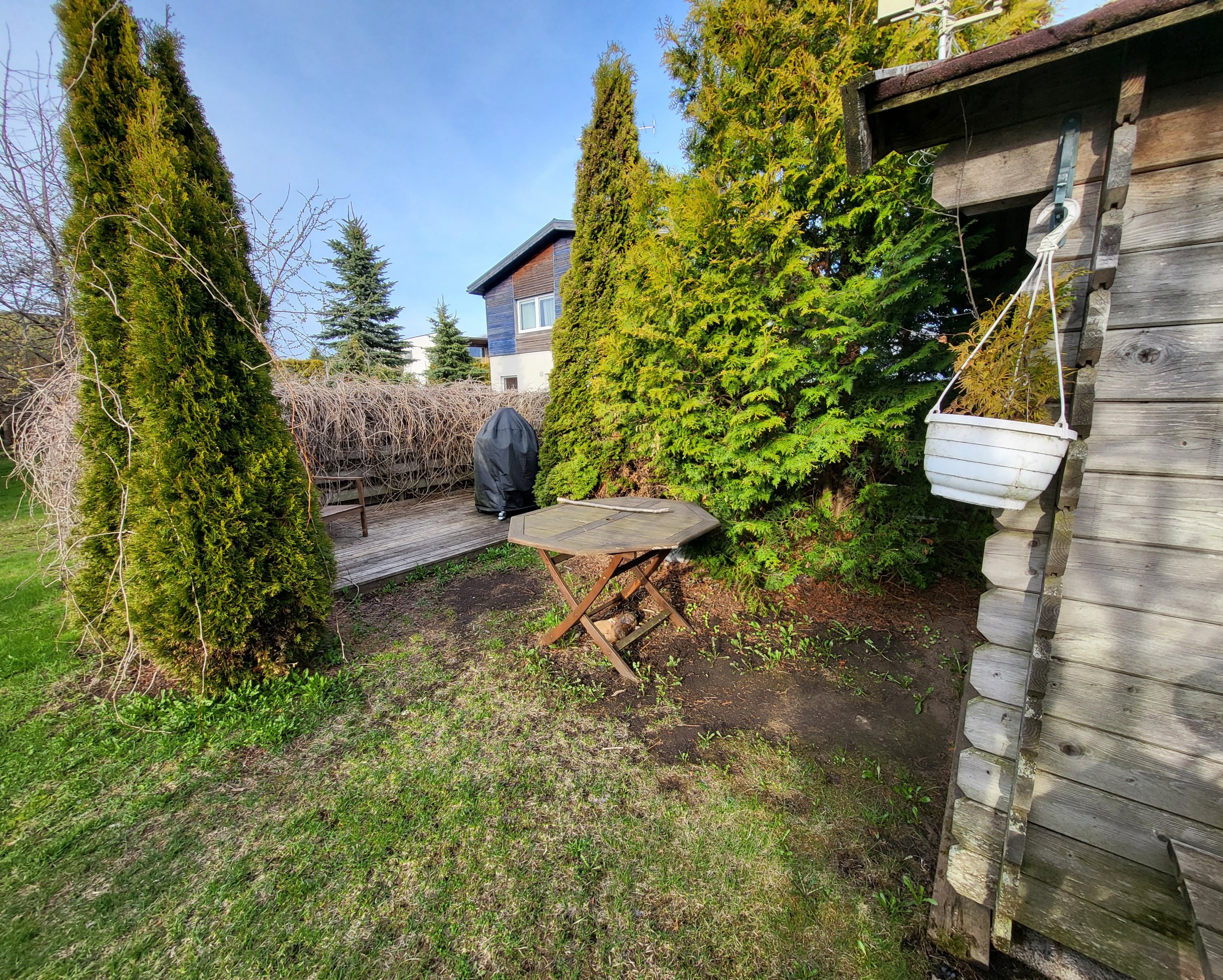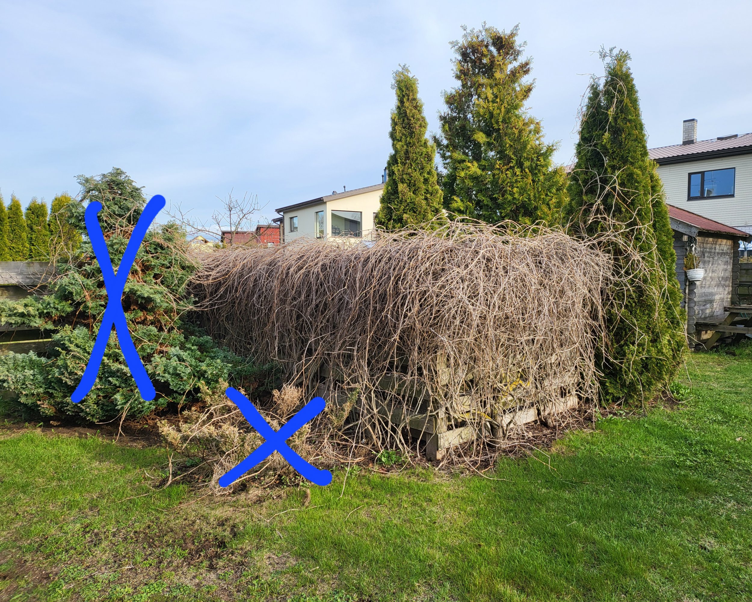 Hinnapakkumine peab sisaldama olemasoleva puidust terrassi ja laudadest aianurga eemaldamist. Samuti peab hinnapakkumine sisaldama 5 metsviinapuu ja kahe pildil märgitud puu eemaldamist ning vanade ehitusjääkide, eemaldatud puude ja pinnase äravedu.