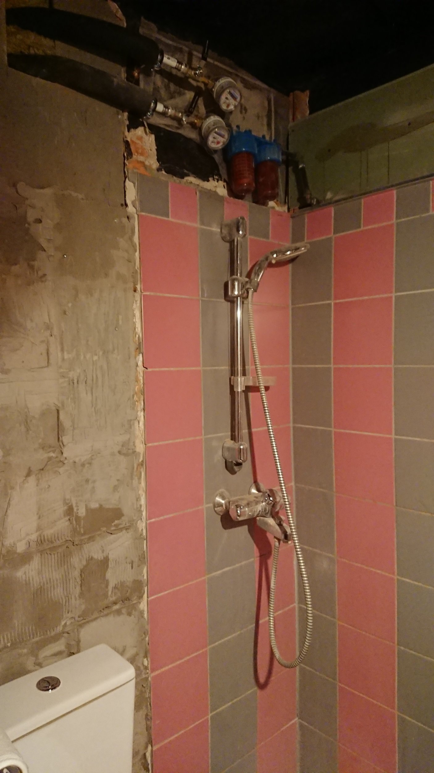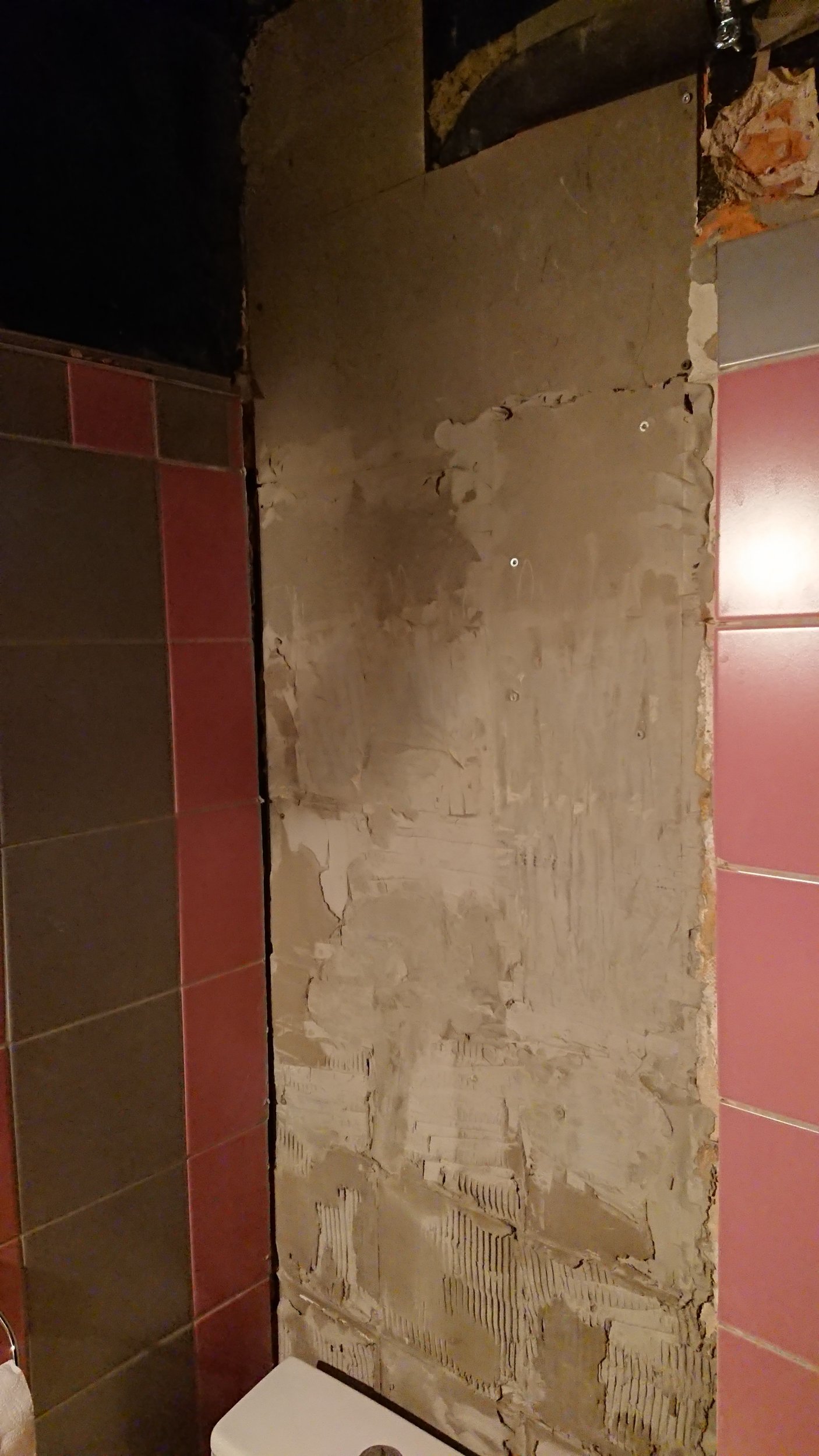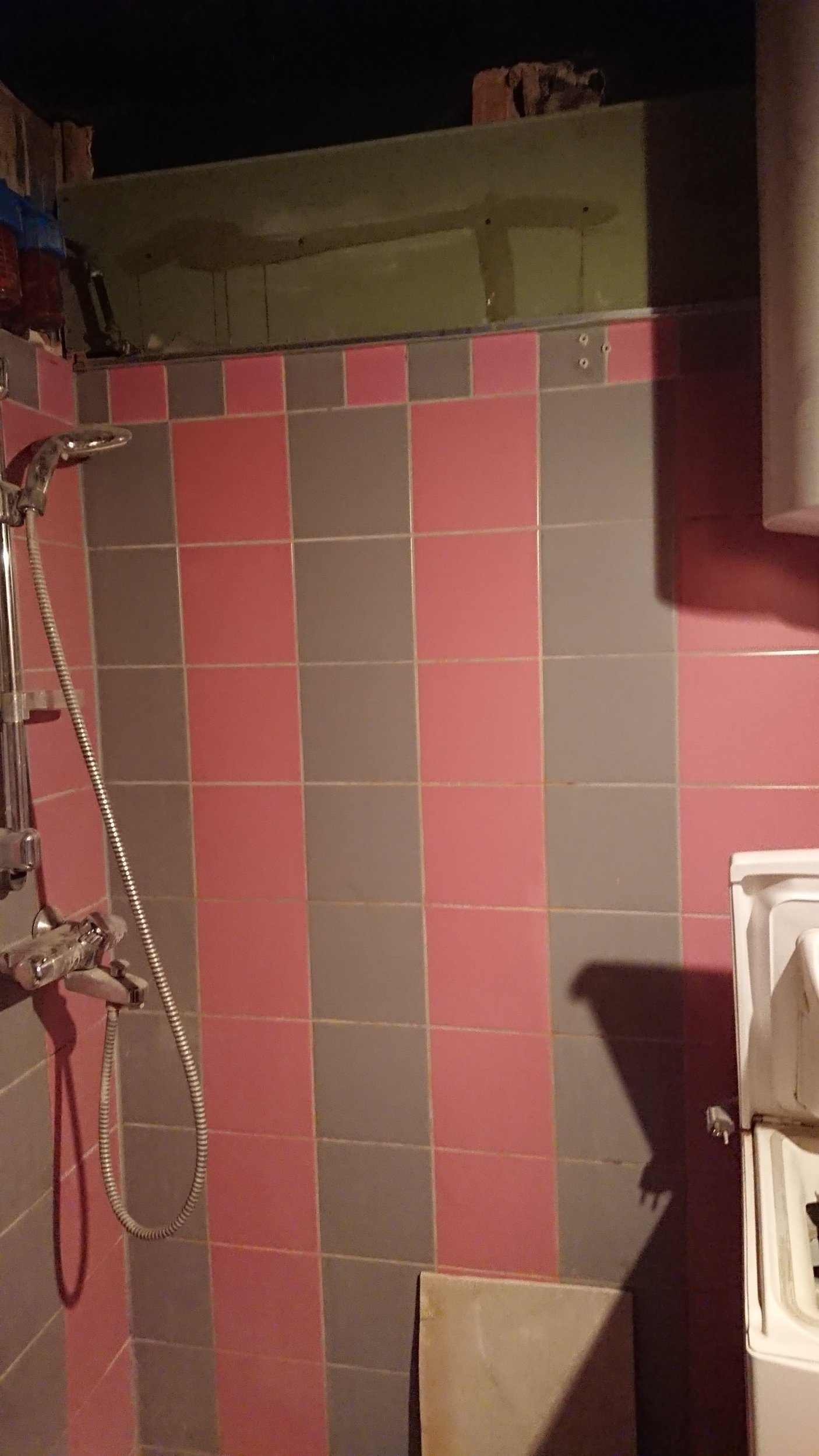 Vaja plaatida vannitoas 4m2 seinapinda, veešahti tagune ja kunagise ripplae peidetud osa. Aluspind vajab tasandamist. Osaliselt torud ees, pildil näha. Ühel seinal kips ei ulatu laeni, vajadusel ka seal pikendada.