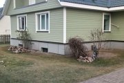 Vana fassaadikatte eemaldus, karkassi ehitus, kivivill 100 mm, tuuletõke, distantsliistude paigaldus, närilisevõrk, krunditud 1x + värvitud 1x voodrilaud paigaldusega, aknapaled ja uksepaled, servaliistud, 2 kiht värvimine kui voodrilaud seinas. |