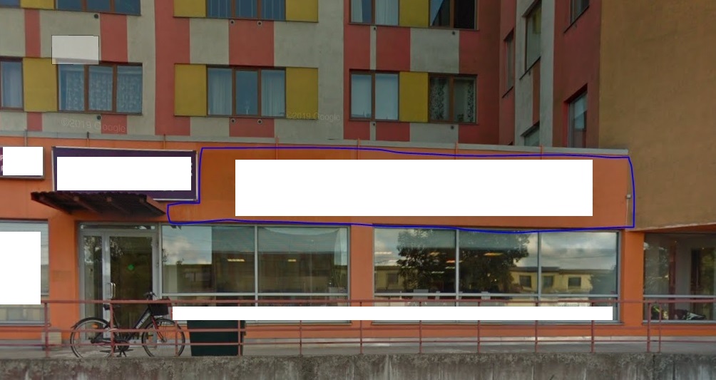 Värvimist koos vajalike eeltöödega vajab pildil sinise kastiga märgitud ala, kokku ca 16 m2. Asukoht on Tallinnas, Kristiine piirkonnas.