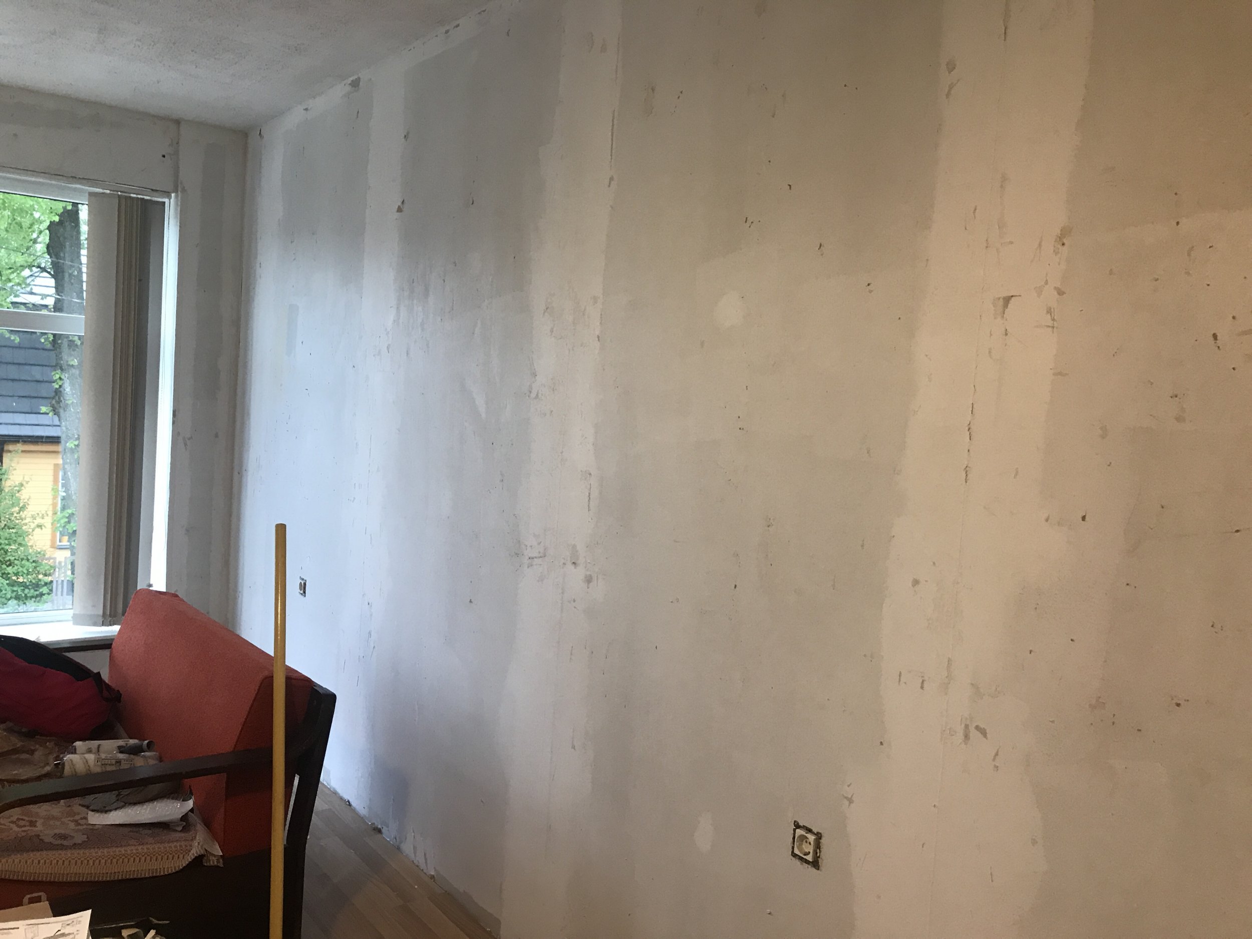 Pisikese stuudiokorteri seinad vajavad värvimist (seinapinda ~42 ruutmeetrit). Enne värvimist tahaks pahteldamist ka pisikesed täkked kipsis (trauma tapeedi eemaldamisest). Kruntvärv on olemas, seinavärvi veel mitte (pole suutnud tooni valida). Hetkel tundub töö endale käivat üle jõu :) Veel vajaksid asendamist liistud akna- ja ukseaukudes.