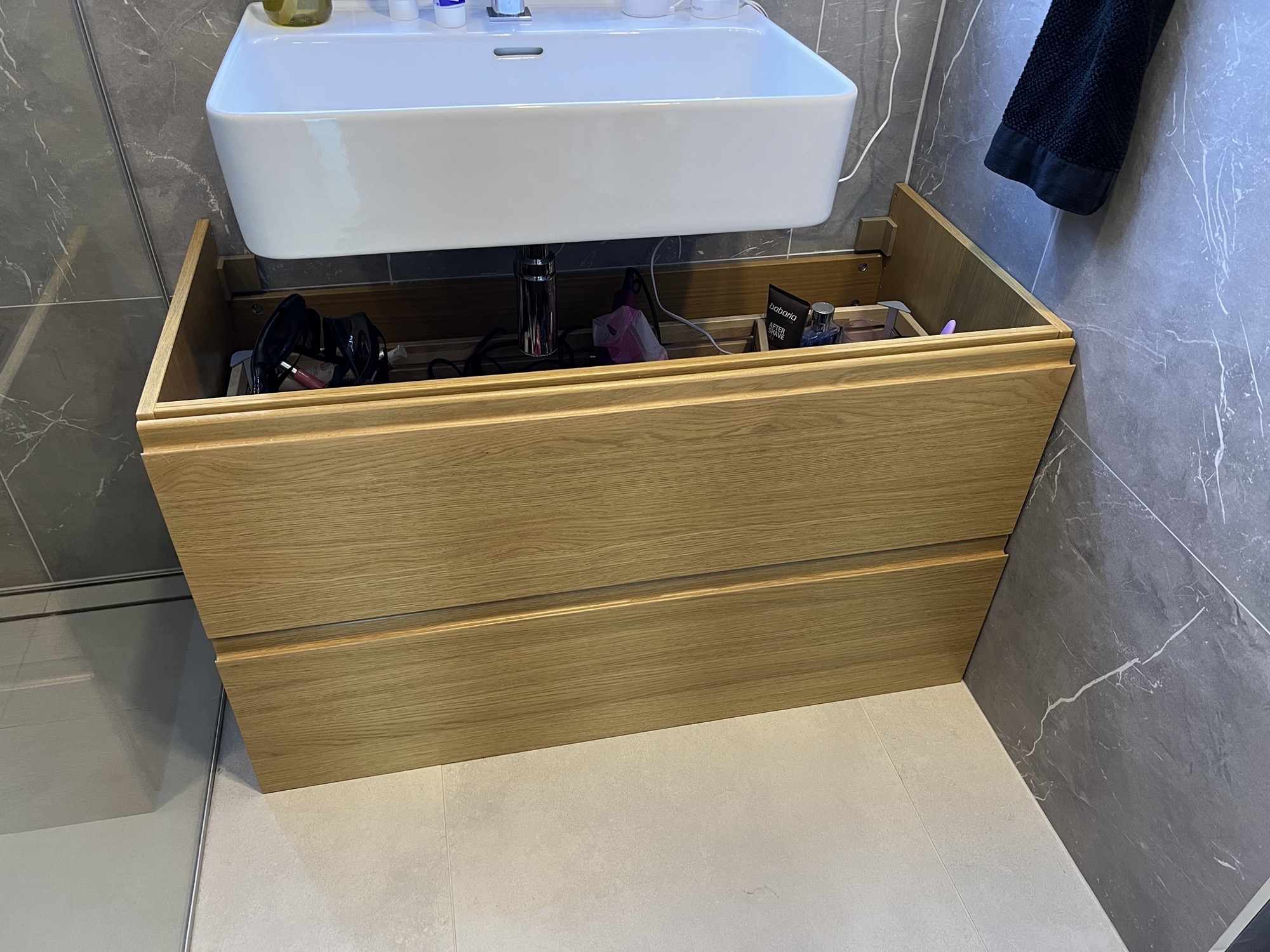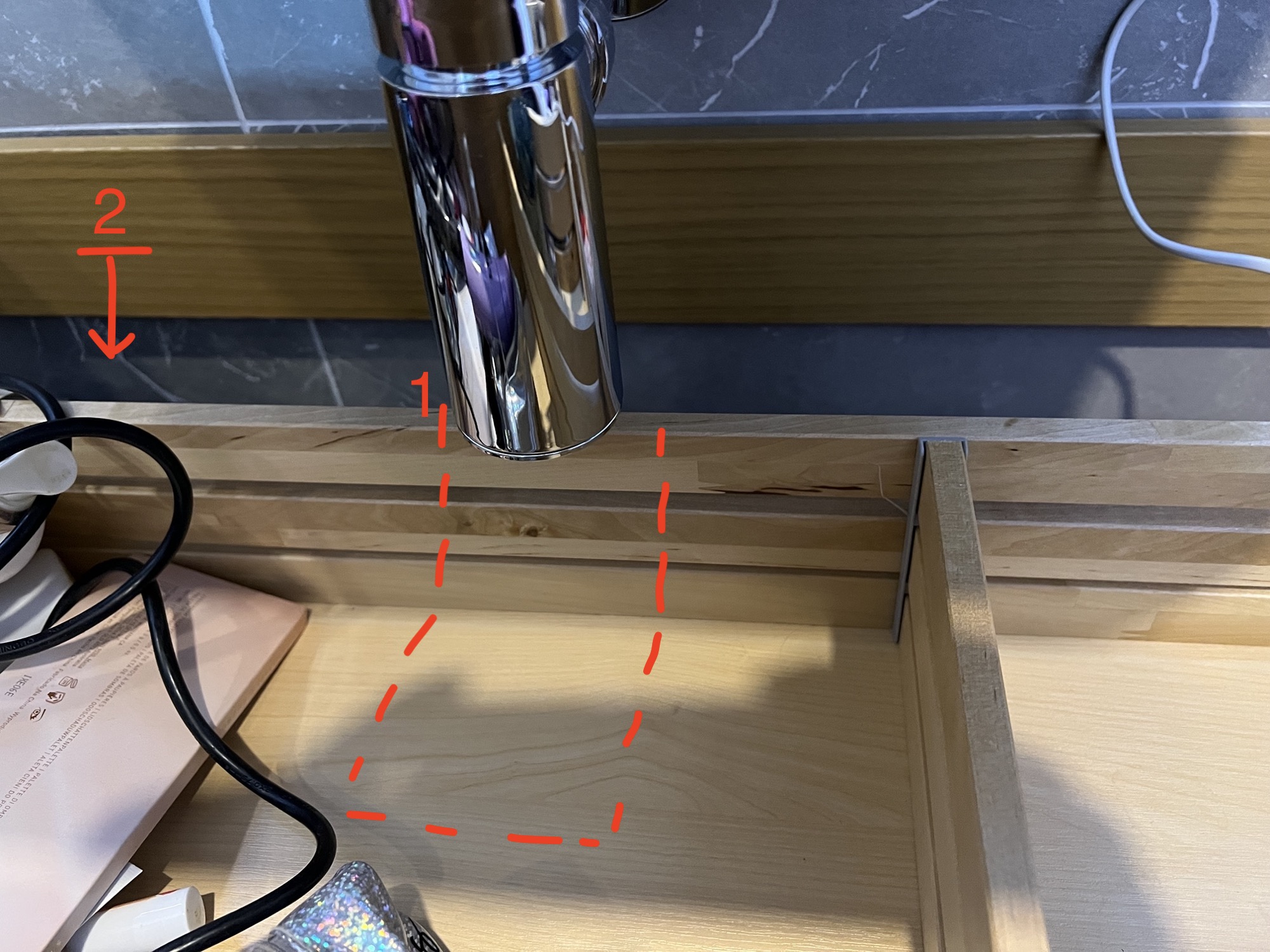 Vannitoakapp tuleks paigaldada seinale valamu alla ning kivisse kinni lasta (https://www.floorin.ee/et/?option=com_floorin&view=product&id=589&roomtype=81), selleks oleks vaja teha ka paar ümberehitust kapis. Kapi sahtlile tuleks teha sisselõige (pildil nr 1), et äravool mahuks sinna ümber ning toestada sahtlit (ideed siinkohal teretulnud), et ta jääks korrektselt käima peale muudatust. Lisaks ka oleks vaja tuua kapi tagumist toestuse tala allapoole samuti selleks, et äravool ära mahuks (pildil nr 2).