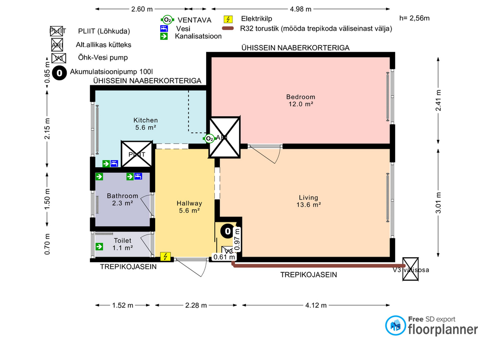 * Elu- ja magamistoas aknaalune radiaatorküte, torustik mööda korteri lõunapoolset seina.