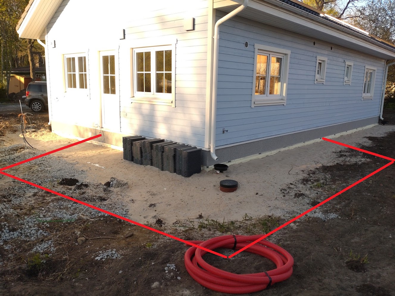Sooviksin uuele eramule terrassi suurusega ca 45m2. Terrass tuleks L-kujuga, täpsed mõõdud on joonisel. Terrassi kõrgus oleks 2 lauda, rõduukse poolsel küljel aste.